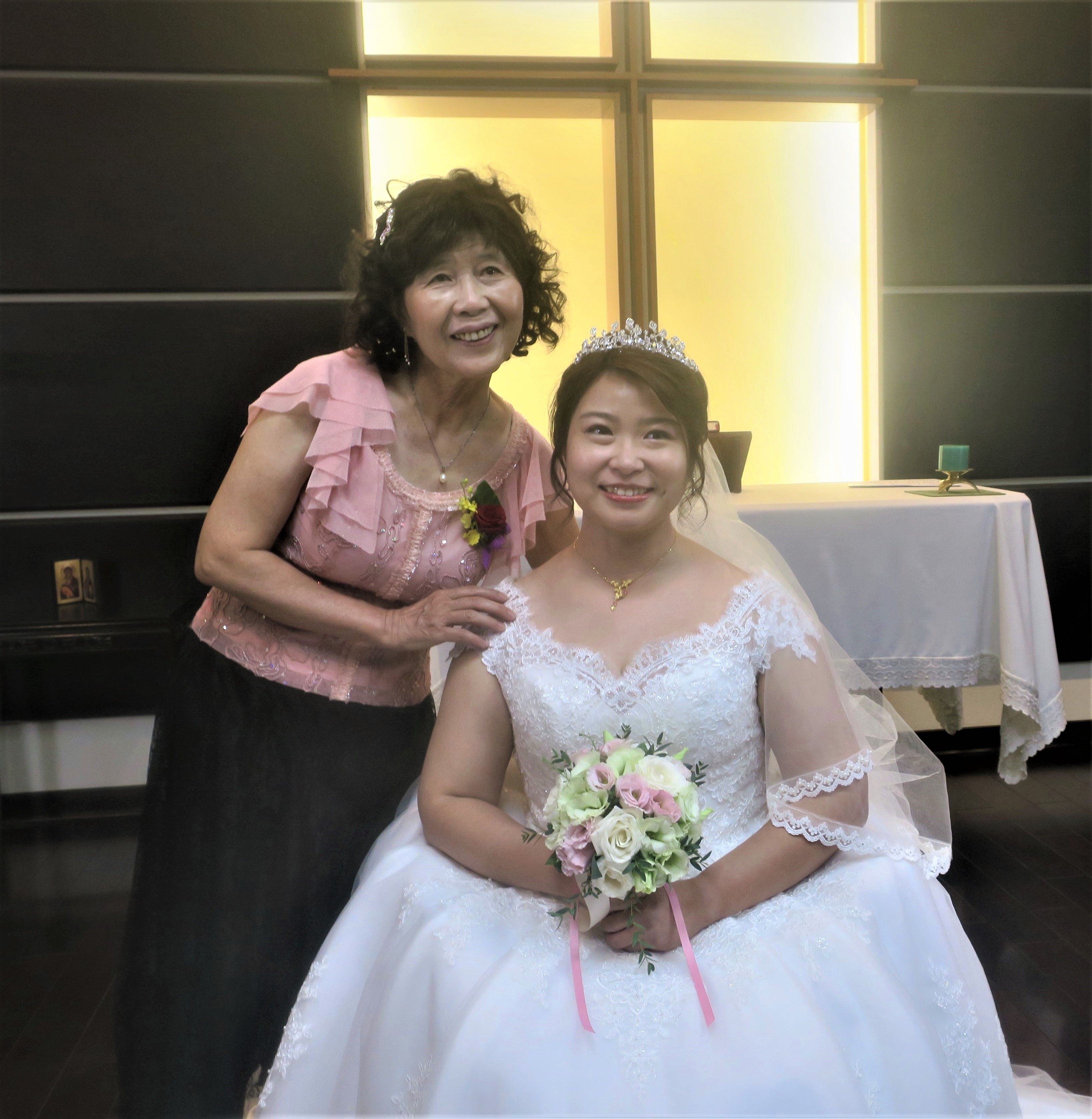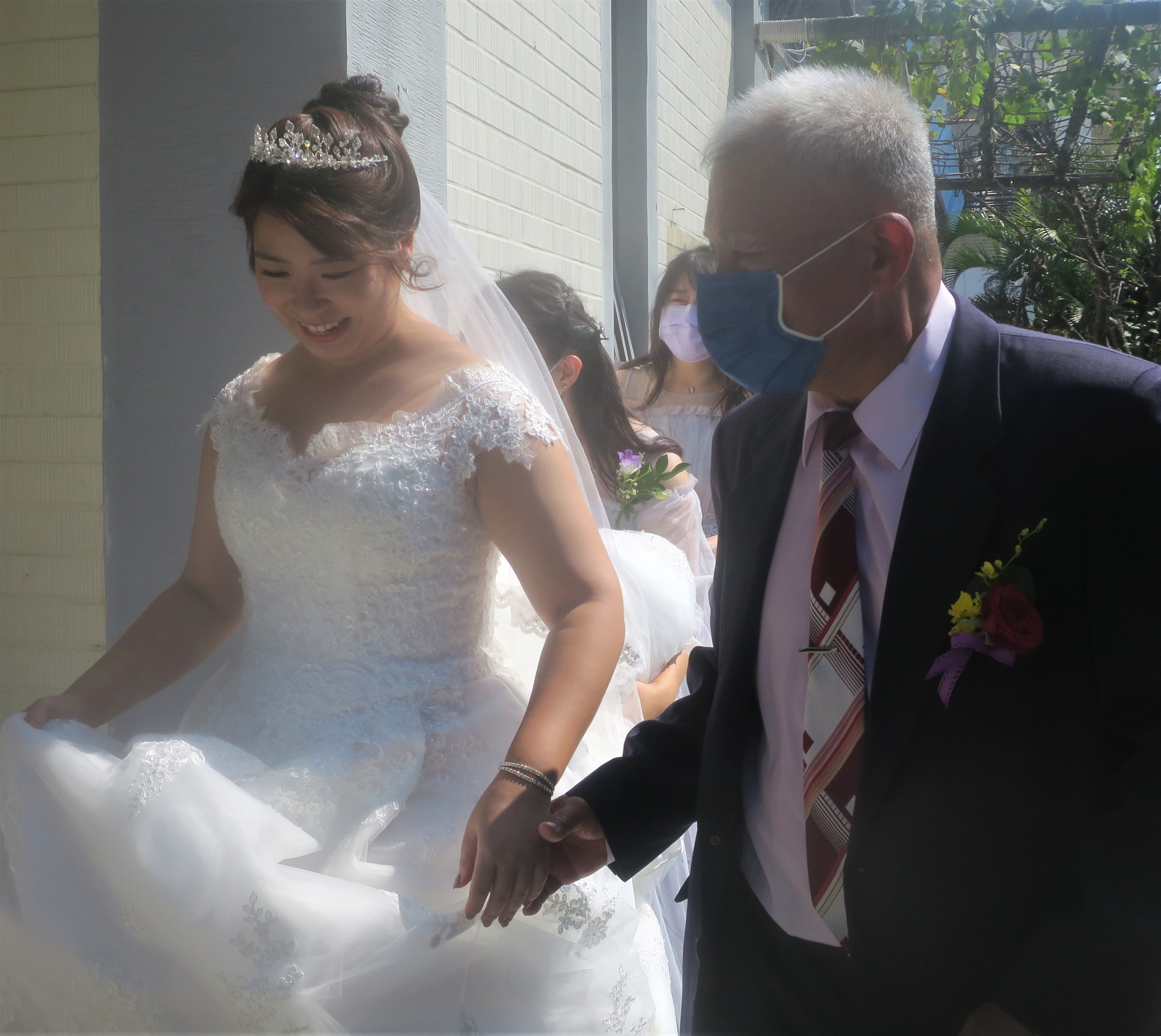 Yu-Lin was our much-loved colleague here at Advent Church and St. John’s University (SJU) for many years, always keeping us on our toes. Life was never boring! She is very friendly, outgoing, extremely creative, multi-talented and highly-skilled in all things technical and practical – from fixing computers to driving her father’s minibus up and down the country. Yu-Lin’s father has long been professor of Electrical Engineering here at SJU and is now also Dean of General Affairs, which means he is in overall charge of the SJU campus and the maintenance of all buildings and equipment. He spends his weekends at SJU instructing courses that lead to license qualifications in everything from plumbing to driving fork-lift trucks, he told me once he has 23 different license qualifications! In between times he is to be found scurrying around the campus, checking the generators, the AC units, driving the workers in his forklift truck to trim some trees or installing lighting to make the campus brighter. Always busy, and in his holidays, he climbs mountains, and takes the family on holidays to interesting places. It was very moving for him, in the pre-wedding event on Saturday, when he and Yu-Lin’s mother placed the veil over their daughter’s head ~ he really struggled to hold back the tears.