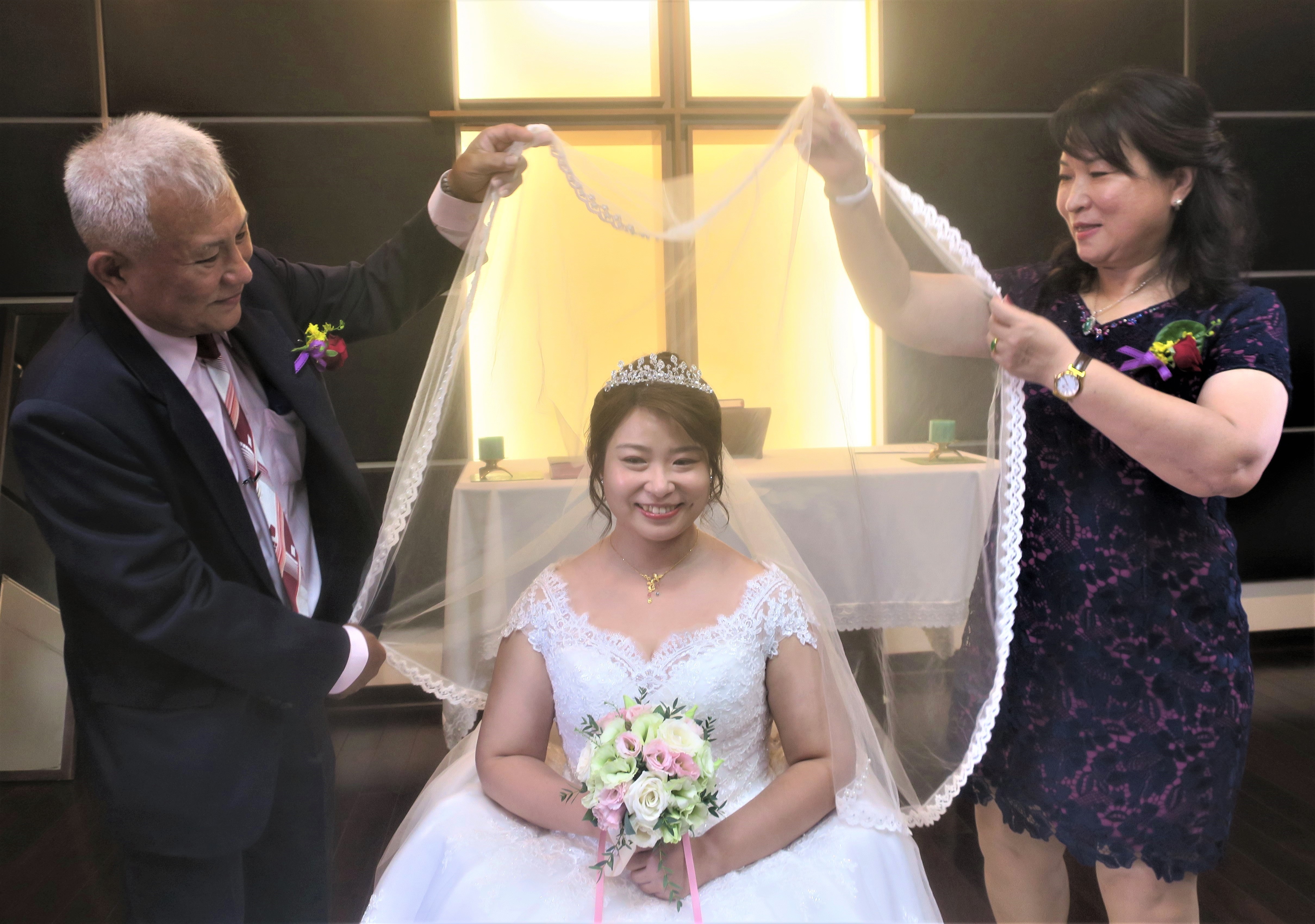 Yu-Lin was our much-loved colleague here at Advent Church and St. John’s University (SJU) for many years, always keeping us on our toes. Life was never boring! She is very friendly, outgoing, extremely creative, multi-talented and highly-skilled in all things technical and practical – from fixing computers to driving her father’s minibus up and down the country. Yu-Lin’s father has long been professor of Electrical Engineering here at SJU and is now also Dean of General Affairs, which means he is in overall charge of the SJU campus and the maintenance of all buildings and equipment. He spends his weekends at SJU instructing courses that lead to license qualifications in everything from plumbing to driving fork-lift trucks, he told me once he has 23 different license qualifications! In between times he is to be found scurrying around the campus, checking the generators, the AC units, driving the workers in his forklift truck to trim some trees or installing lighting to make the campus brighter. Always busy, and in his holidays, he climbs mountains, and takes the family on holidays to interesting places. It was very moving for him, in the pre-wedding event on Saturday, when he and Yu-Lin’s mother placed the veil over their daughter’s head ~ he really struggled to hold back the tears.