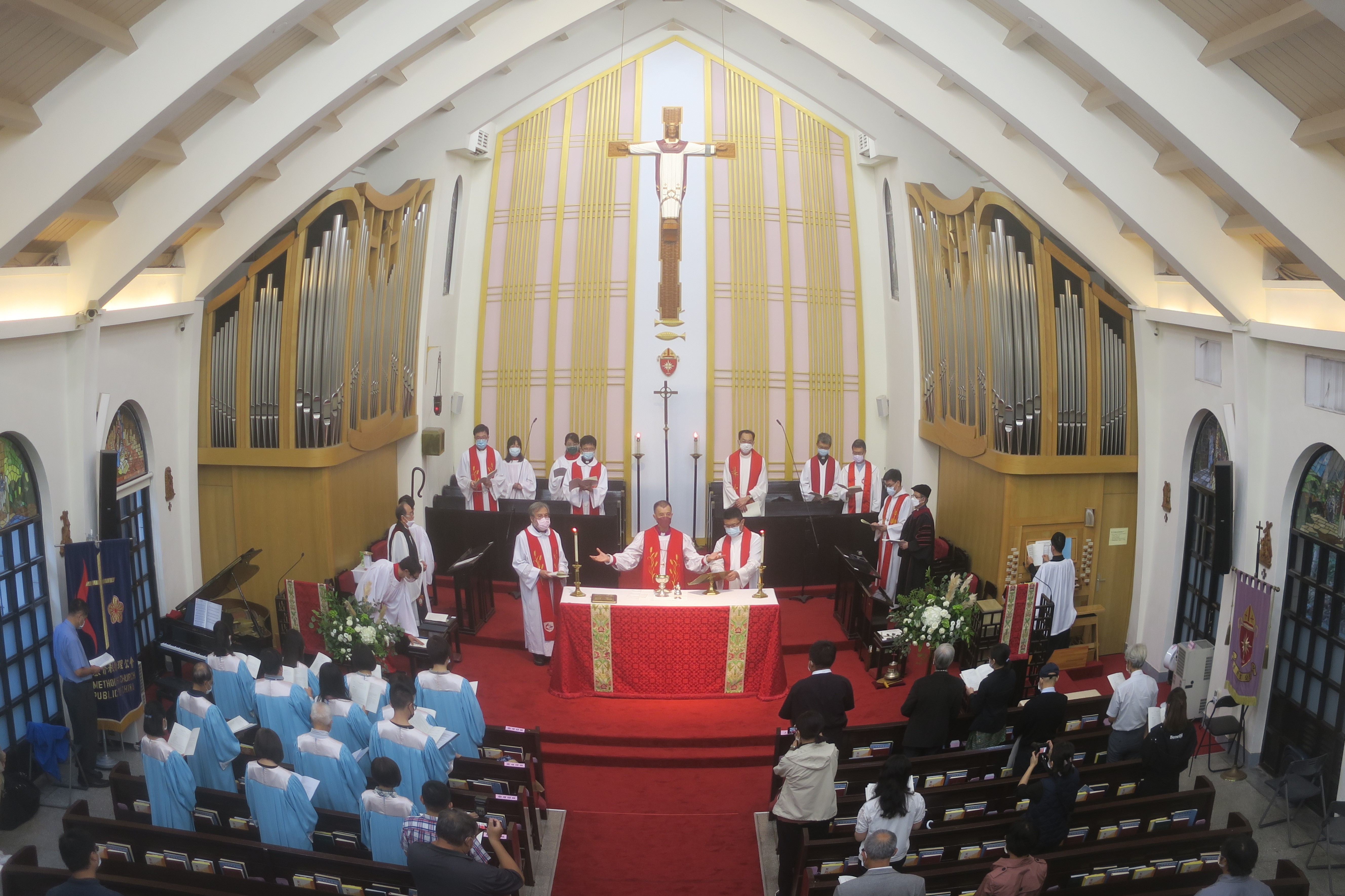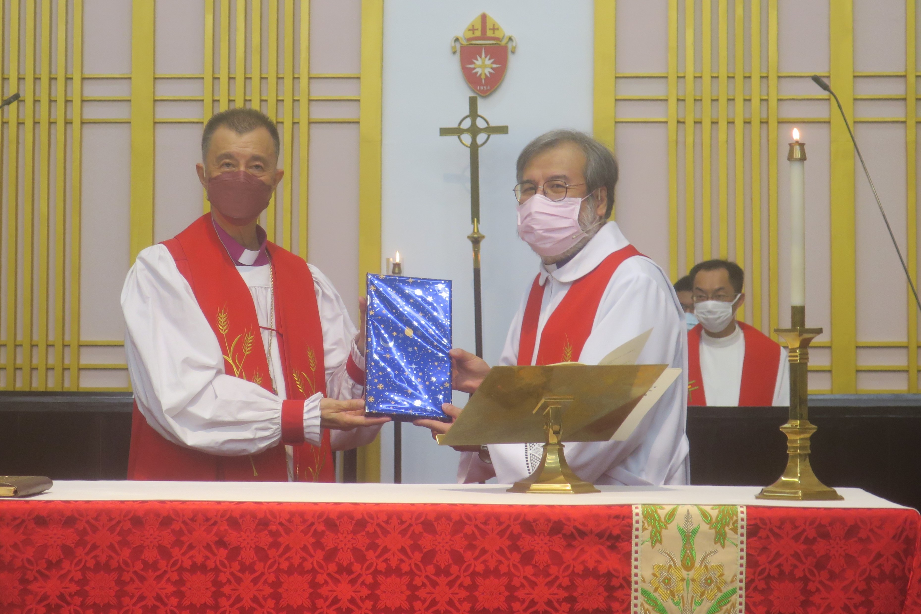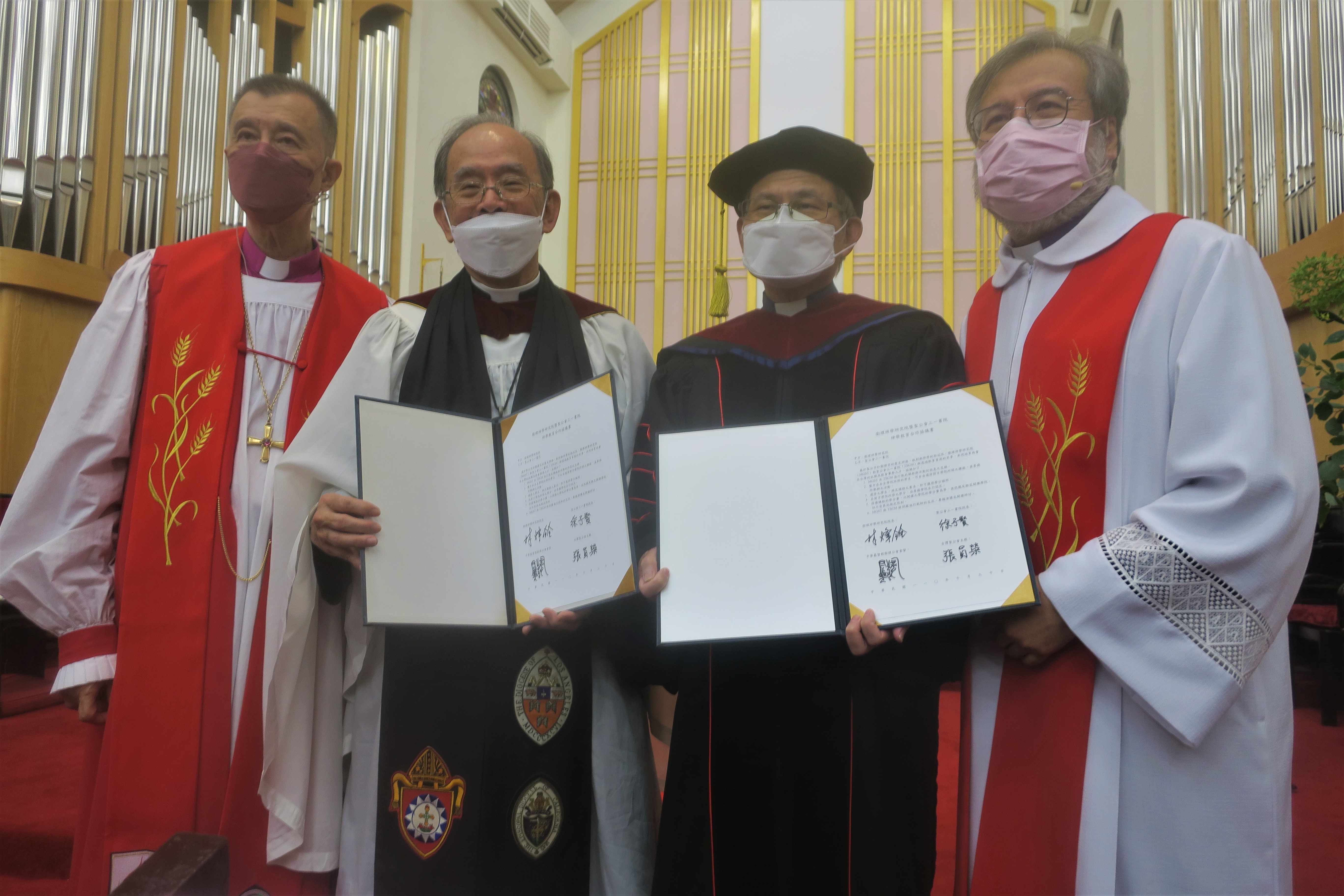 The signing of the agreement took place during a Thanksgiving Service held at St. John’s Cathedral, Taipei at 3:30 pm on Saturday October 30, 2021, postponed from the original date of Trinity Sunday, May 30, due to the pandemic. Taiwan is currently under Level 2 Restrictions, so facemasks are compulsory at all indoor events, but are allowed to be removed for a few seconds to take group photos. This was the whole group after the service …..