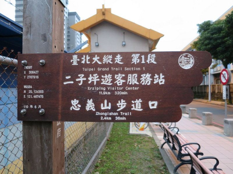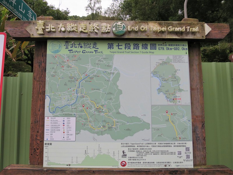 The trail is divided into 7 sections, 5 for the northern part, starting at near sea-level at Guandu 關渡 MRT Station on the western side, going up over the YMS Mountains and down, then a branch off across the middle of the city along a hilly ridge and down to Jiantan 劍潭 MRT. The southern part has 2 sections, going along the Nangang 南港 Mountains to the east of the city, and finishing at Maokong 貓空, up in the tea plantations above Taipei Zoo. Each section is arranged to start and finish at either a Metro MRT station or a bus stop that links to one, and if you’re reasonably fit, then each section can easily be done in about 4-5 hours of walking, although there is a lot of climbing. But then it is a mountain trail, so upwards and onwards is the way to go. Total length is officially 92 km. This is the official sign…