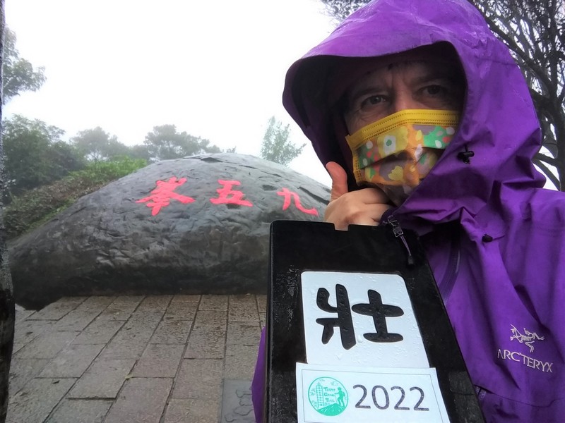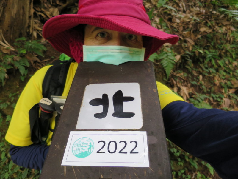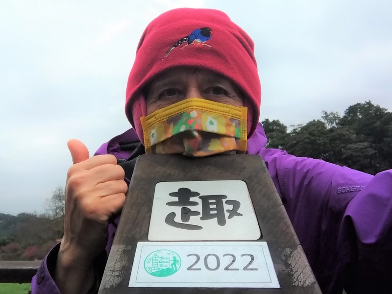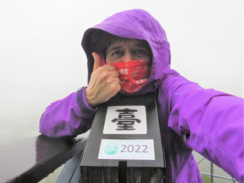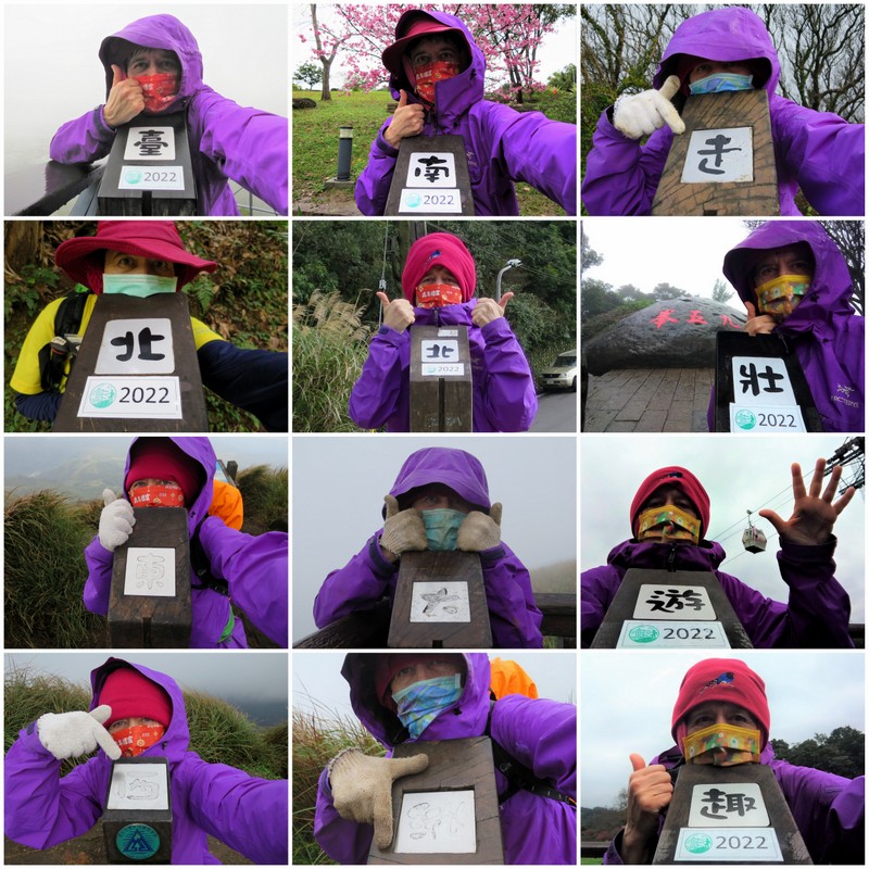 Picture the city of Taipei built in a river basin, surrounded by mountains on 3 sides, the 4th side being the river running roughly northwestwards out to the sea. Although most of the basin is built up, right of the river is actually known as Taipei City, while left of the river and far north, south, east and west is the old Taipei County, now known as New Taipei City. Taipei City boundaries go north right up to the beautiful Yangmingshan (YMS) 陽明山 Mountains, and so the Taipei Grand Trail, an initiative of the Mayor of Taipei City, goes around Taipei in a kind of semi-circle. It’s a bit confusing though, because some of the mountains that surround Taipei are officially in New Taipei City, so they are not included in the Taipei Grand Trail. Anyway, there are 12 special signposts along the whole trail, often at ‘viewpoints’ (though I hardly saw any views, only rain and fog!) with a Chinese character on the top of each one, some also with a notice of the year 2022. Arranged together, the Chinese characters spell out the phrase: 臺北東西南北大縱走壯遊趣, aka the Taipei Grand Trail. The idea is to take a selfie at each one, then combine them into a collage, for which you can get a prize on presenting the photo at the government office in charge of the trail, as a souvenir to show you’ve completed the challenge. This is mine: