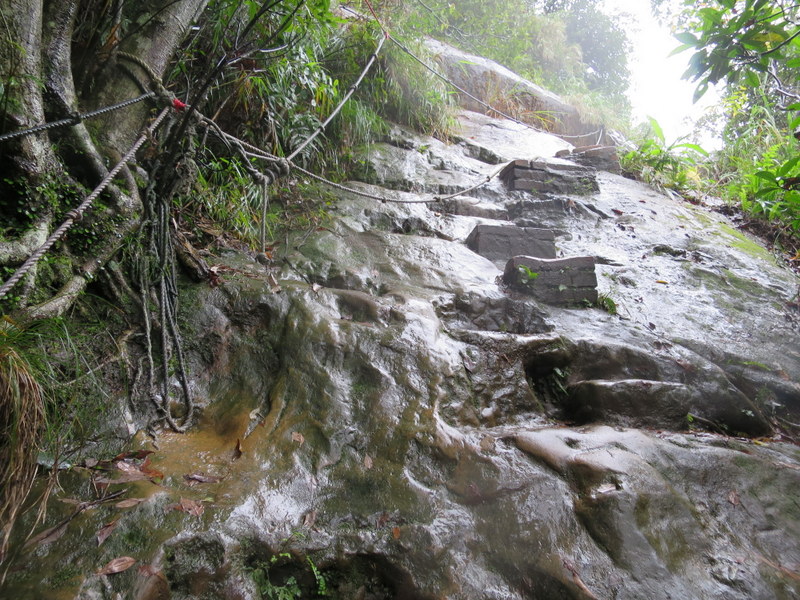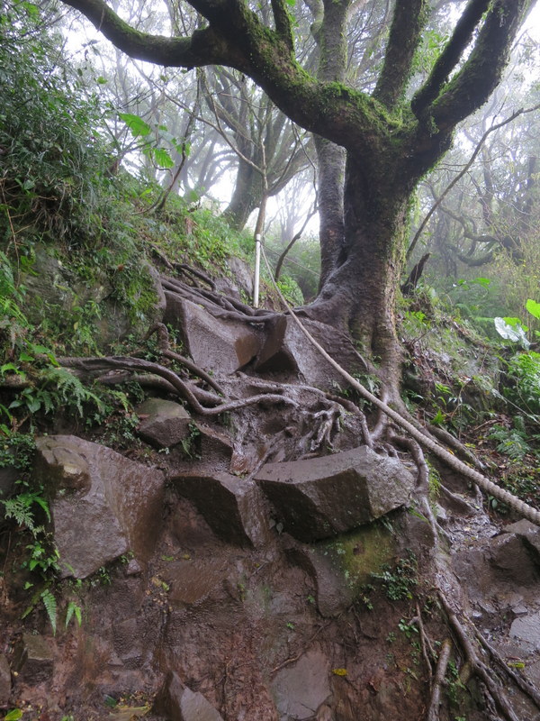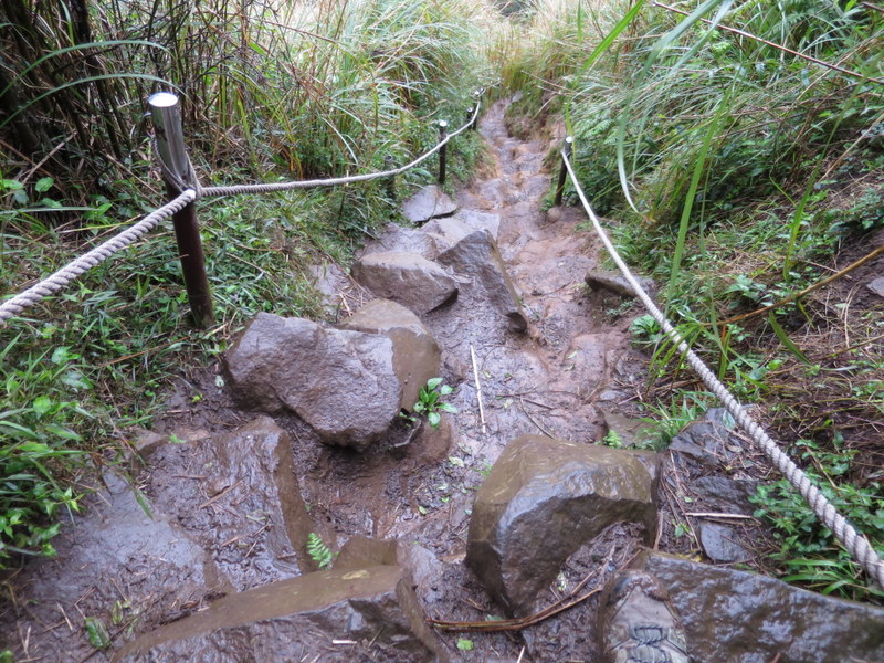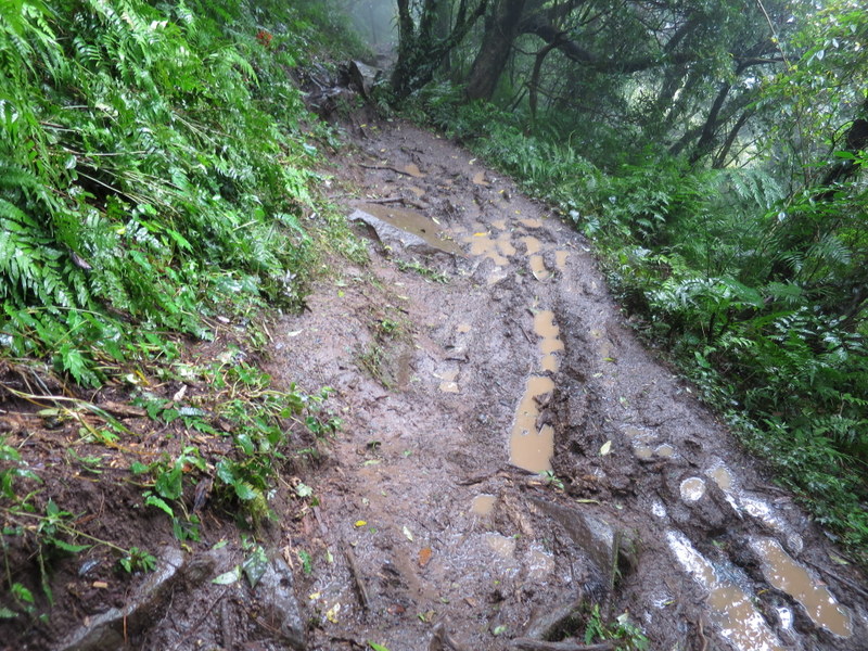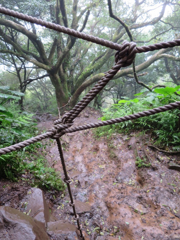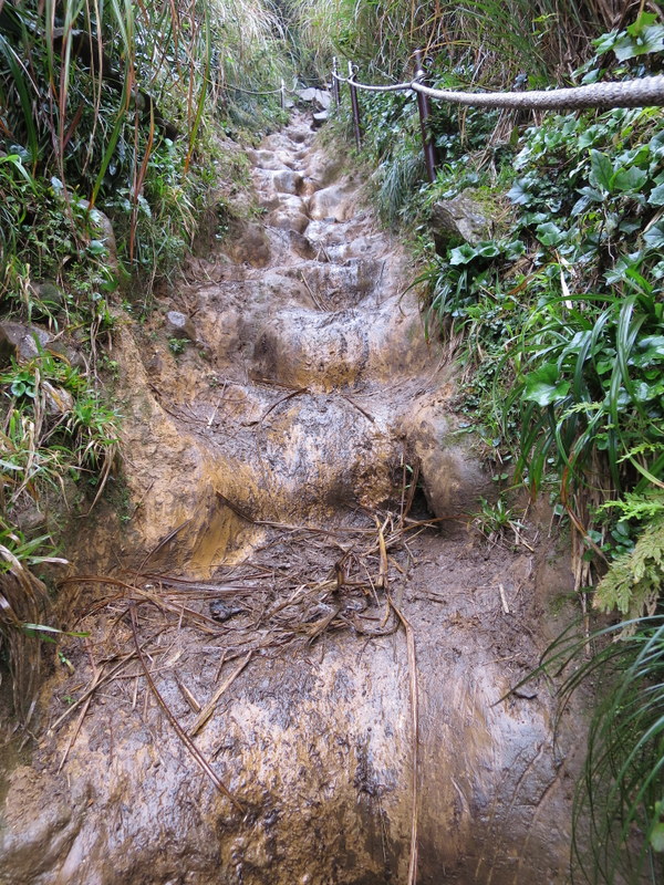 The following day, Friday January 28, the rain came down in torrents, and I had a day off. The forecast for Saturday January 29 was heavy rain in Tamsui, but light rain up in the YMS Mountains. So off I went to do Section 2! I had done this section many times before, up and down Datun West, South and Main Peaks 大屯山 , so I knew the trail to be very wet and muddy – there’s a lot of ropes that you need to use to pull yourself up, and the paths are slippery; and I also knew that being CNY so there wouldn’t be many people there braving the elements. Fortunately, at the start of the trail, I met a man who told me he was also doing the same route that day, but with a group who would be about an hour behind me. Kind of reassuring given the weather! As it was, I then saw nobody until I got to the top of Datun Main Peak, where out of the rain and fog on the road that goes up there appeared 2 foreigners on YouBikes, they had ridden all the way up from Taipei! They said they often rode up on real bikes, but always dreamt of coming up on YouBikes. YouBikes are designed for people like me to cycle in and around the city, they have 3 gears and a basket on the front. Not for the high mountains. So crazy! But, like me, they thought that if they wait for the good weather, they may wait weeks, and given that this is the weather, then why stay home? Just do it! Ah, we love all this rain, rain and more rain. By the time I got to Xiaoyoukeng 小油坑, I was totally soaked!