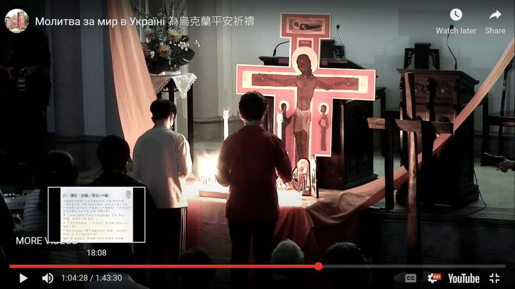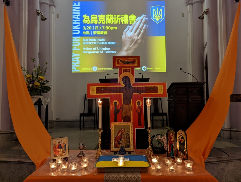 And later that evening, last Sunday, I attended a Taizé service run by the National Council of Churches of Taiwan, to pray for Ukraine. It was held in the Jinan Presbyterian Church in central Taipei, and also attended by Taiwan’s former vice-president, Chen Chien-Jen 陳建仁, a Roman Catholic, plus other government representatives and church leaders. That day was the 25th day since the war started, and the service started with the bell tolling 25 times, once each for those 25 days.