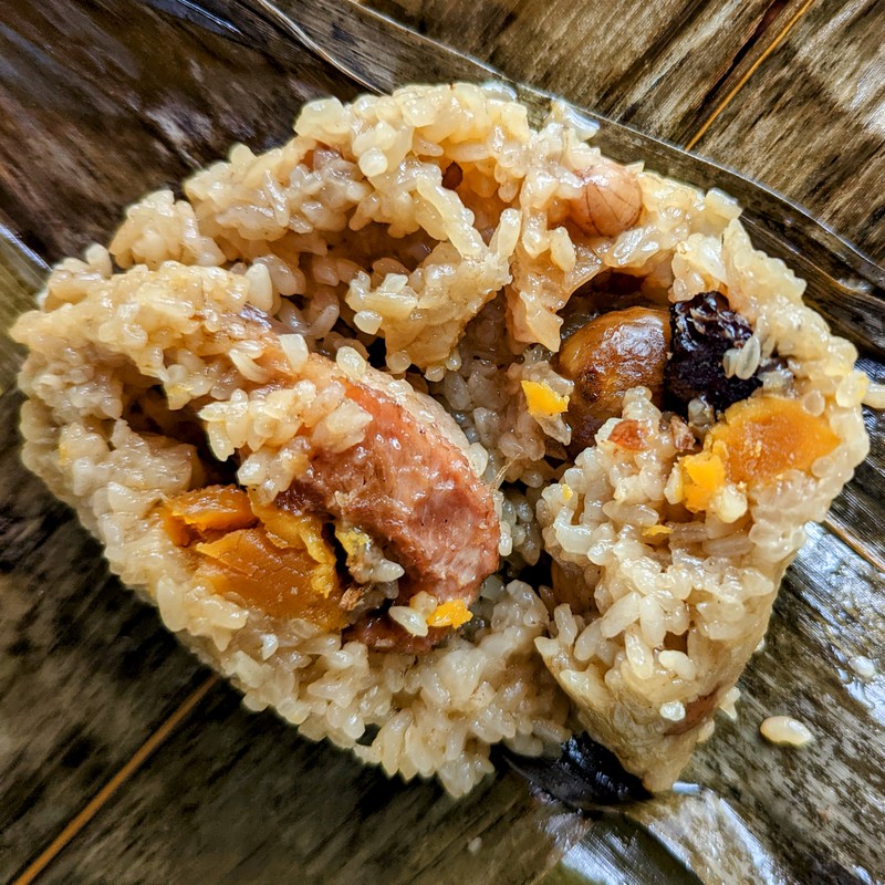 It’s also the Queen’s Jubilee in the UK ~ but here in Taiwan we’re celebrating Dragon Boat Festival, mostly by eating and giving zongzi in large quantities. Zongzi are sticky rice dumplings made in a triangular shape, with a variety of fillings, meat, eggs, peanuts, etc and steamed or boiled, depending on where the zongzi are from. They’re wrapped in bamboo leaves, and tied up in string, served warm…