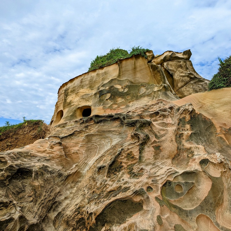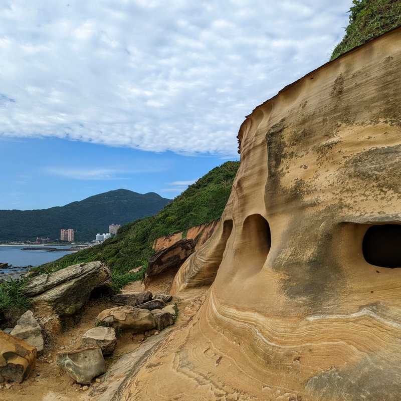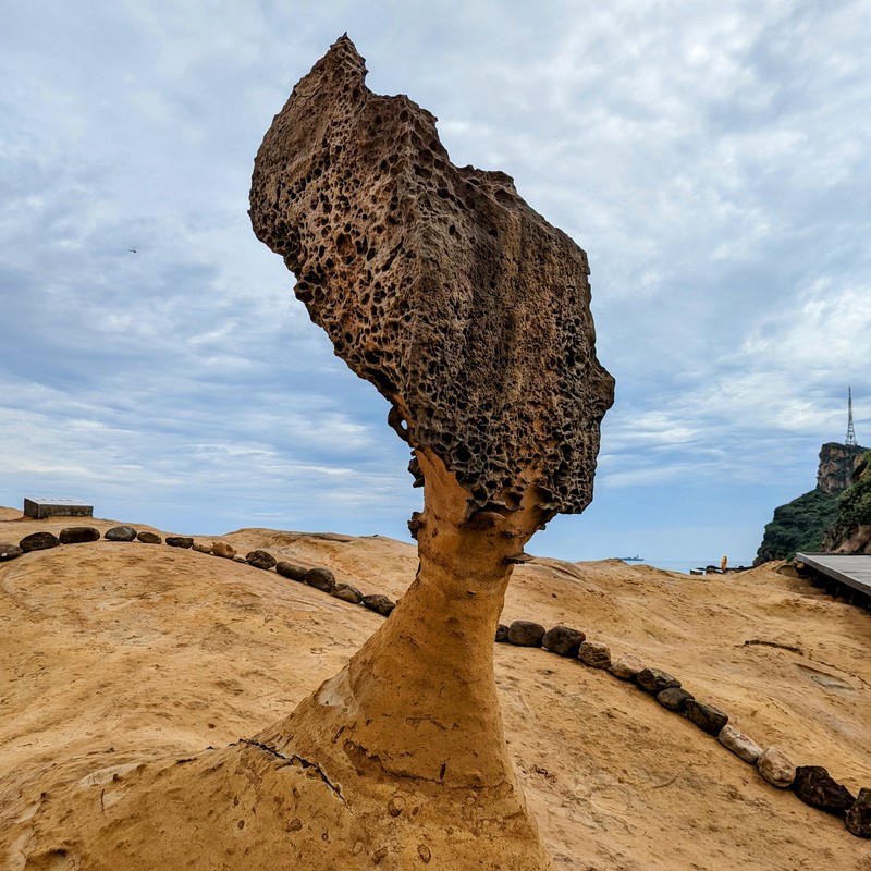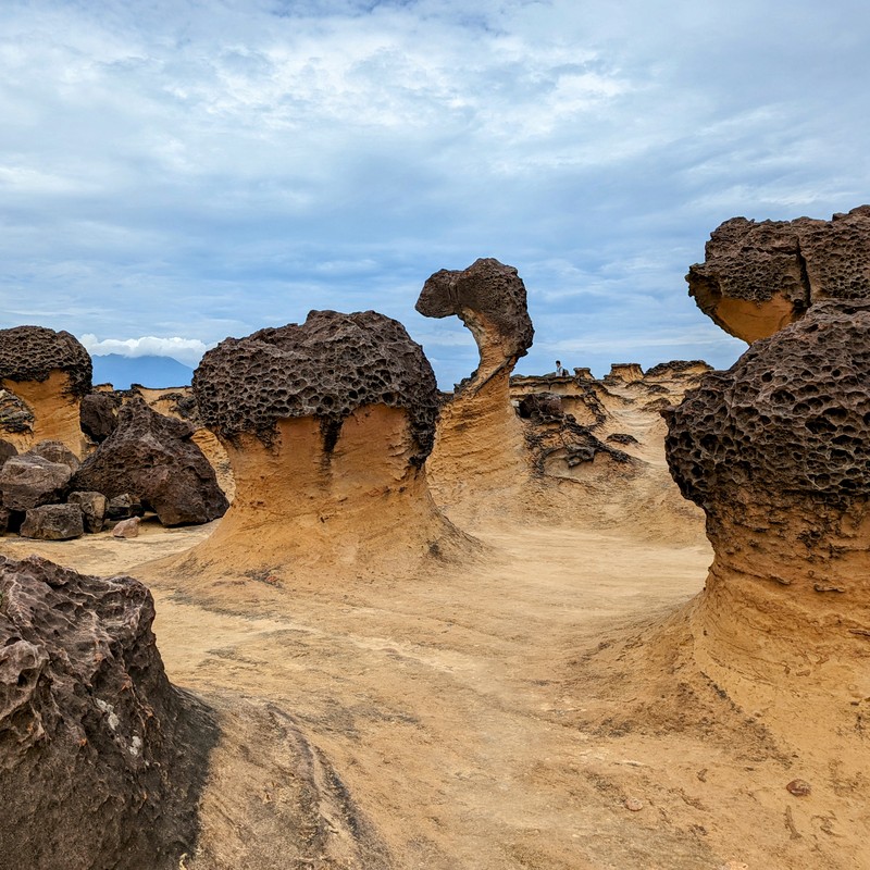 When the rain stops, then we’re out and about! Cycled on the You-Bike into the sunrise, past the northern tip of Taiwan lighthouse, and around the northern coast to Yehliu Geopark. It’s full of stunning rock formations, most famously The Queen’s Head, which is having its neck gradually eroded by the wind and salty air…