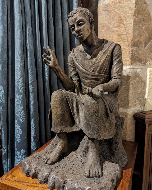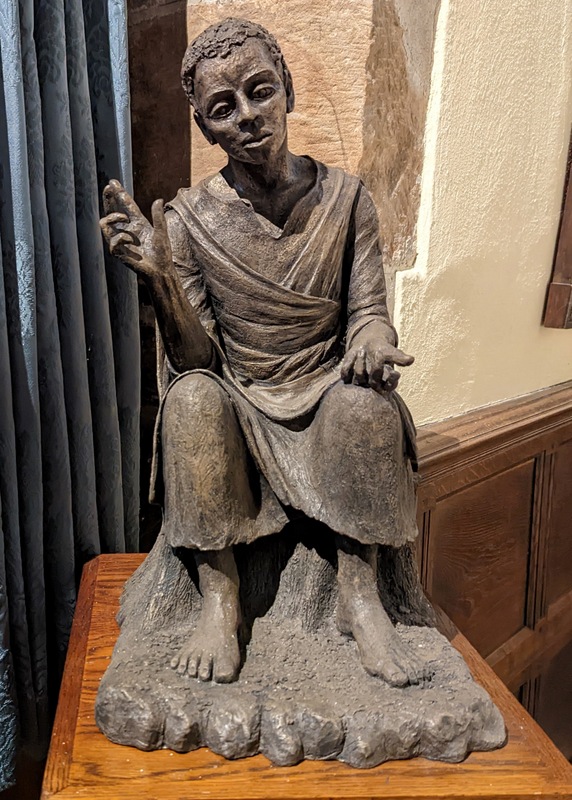 The church has a small and very interesting sculpture called ‘Christ of All Nations’, cold cast bronze by Ruth Pavla Davey, 2012: “This sculpture of Christ expresses a timeless quality which combines contemporary simplicity and rough textures with memories of icons and Romanesque stone carvings. Although its pose retains a traditional sense of authority, it also suggests a possibility of friendship and deep emotional and spiritual connection. The inclusiveness of Christ’s message is very important in the Twenty-First Century, and here He belongs to no specific time, place or race. His multi-national features contribute to the idea of an accessible universal image. Initially modelled in clay, the figure’s movement and energy flow upwards from the earth towards heaven, and outwards to us in a gesture of loving welcome. His strong bare feet remind us of Christ’s earthly life, and time spent in the desert, and of the human suffering which he shares compassionately with us” …..