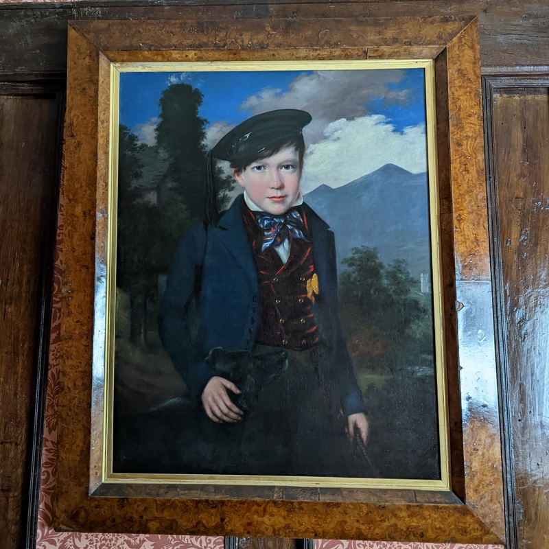 This is “Oil painting on canvas, George Browne X (1834 – 1914), British (English) School, circa 1842. A three-quarter-length portrait of Master Browne aged about 8, in a Lakeland setting by a local artist”….