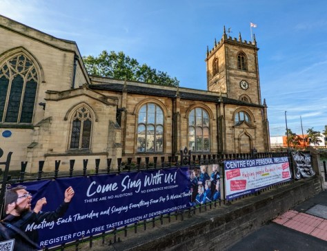 Just across the road at Dewsbury Minster, though, the church is humming with activity early on a Sunday morning. The sound team arrive very early to set up the “Dewsbury Minster of All Saints” Facebook Livestream of the main service, starting at 10:30 am….