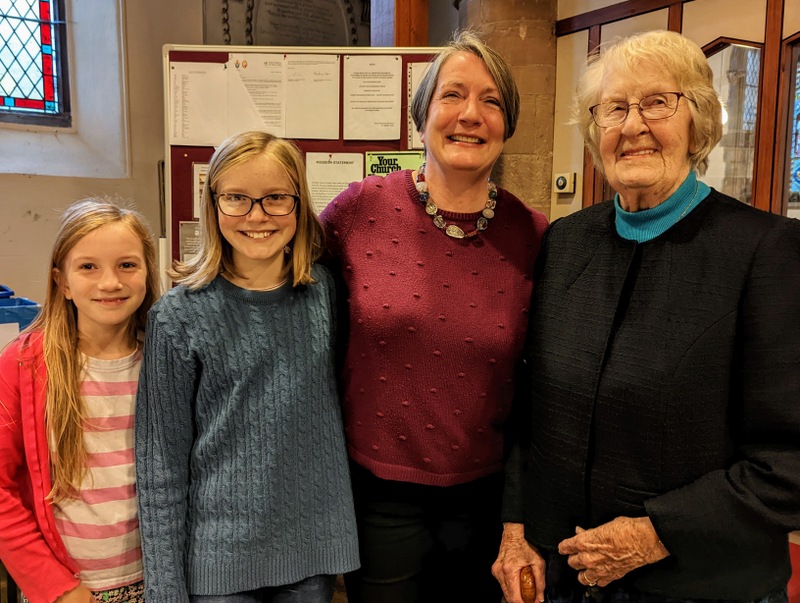 All Saints, Hurworth is quite an amazing church, given the circumstances. Many churches that endure long interregnums kind of give up, or just move into survival mode until a new vicar comes along. But not Hurworth. Despite (or maybe even because of?!) years of uncertainty about the future, and in a pandemic too, they seem to be thriving. Nobody in the congregation I talked to even mentioned that they lacked a vicar, they are so used to running everything themselves. They have a talented and committed group of lay leaders – everyone is doing something and doing it really well. Paul, the official lay reader couldn’t be there, so John led the service, and in the afternoon, there was to be a baptism, led by Jill, in charge of baptisms. Special thanks to Julia, Hurworth’s only churchwarden, bravely taking on all that responsibility for a church where many of the congregation are at least a generation older than her. Not many would willingly volunteer for such a post! And she runs the zoom streaming as well, and everyone appreciates how her whole family are there each week, serving in the church. This is Julia with some of the oldest and youngest members of All Saints Church!