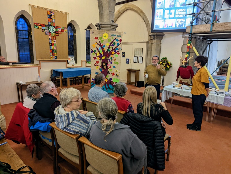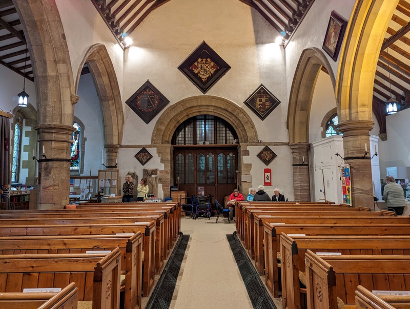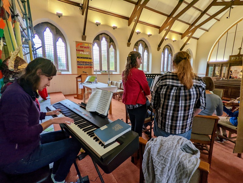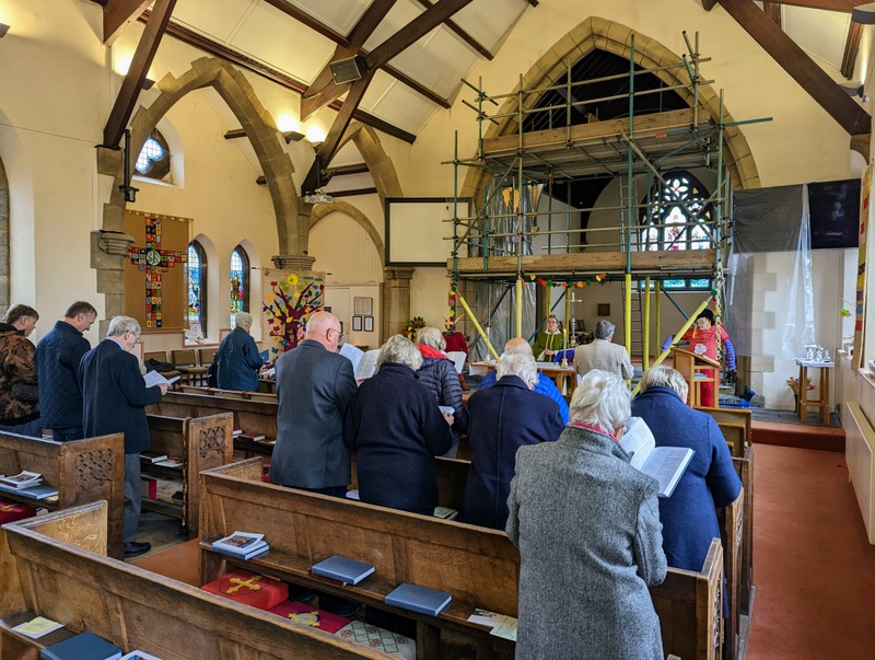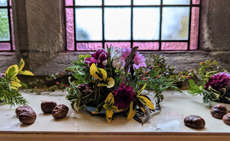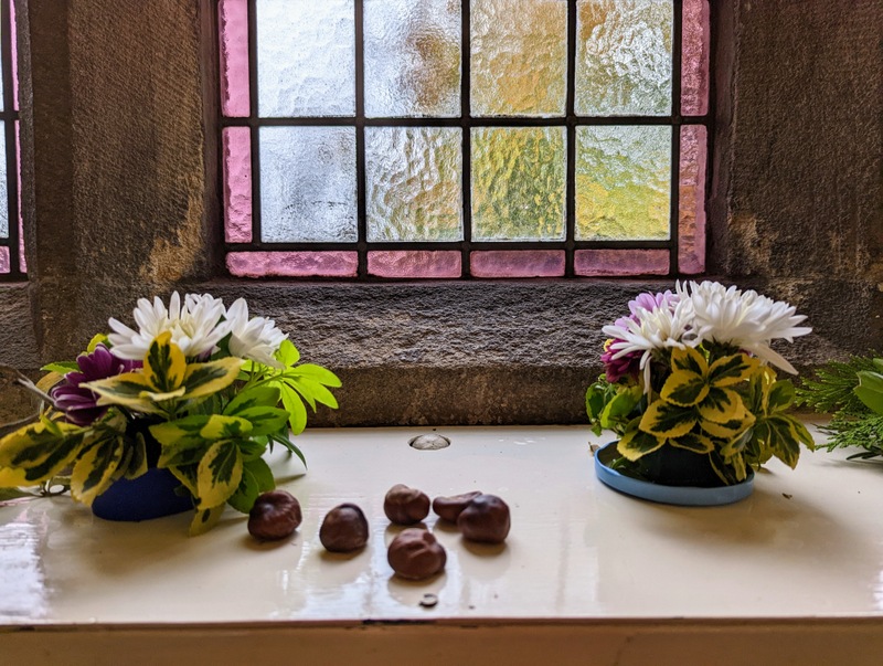 The church is a modest building that’s currently got scaffolding in the chancel to deal with falling plaster, which kind of adds a new perspective to worship, but there’s also lots of colourful banners on the walls too. Last week, the church had a half-term holiday club on the theme of scarecrows, and several of the scarecrows and other artworks were decorating the church. It may have been a dull and miserable autumn day outside, but inside it was definitely warm and cheerful, full of light and joy!