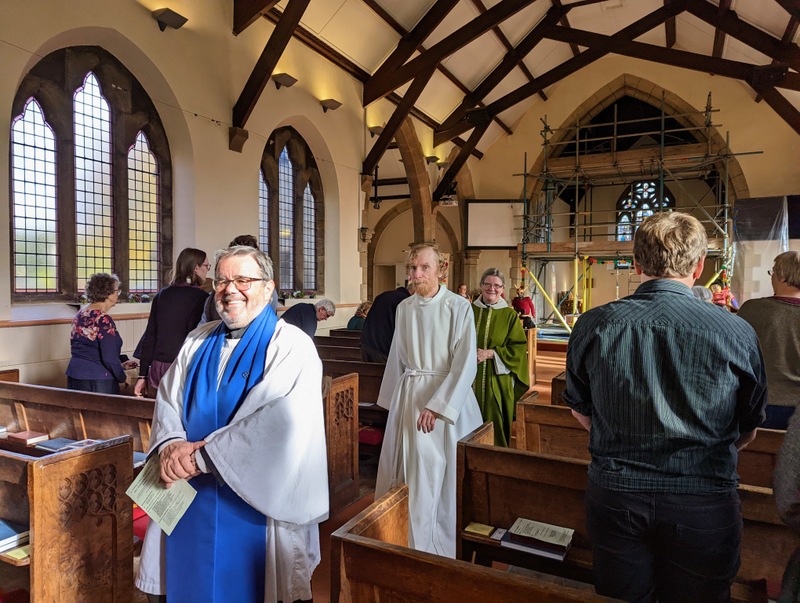 The All Saints service was led by a very lively and friendly retired priest, Fr. Michael Thompson, who turned out to have once been vicar of North Hartismere area of northern Suffolk, neighbouring benefice to my link churches in South Hartismere, and where my good friend and former CMS regional manager for Asia, Adrian Watkins, is now vicar, and where I’ll be visiting in a few weeks time. We had to take this photo for mutual friends in Suffolk – Betty Wells, this is for you!