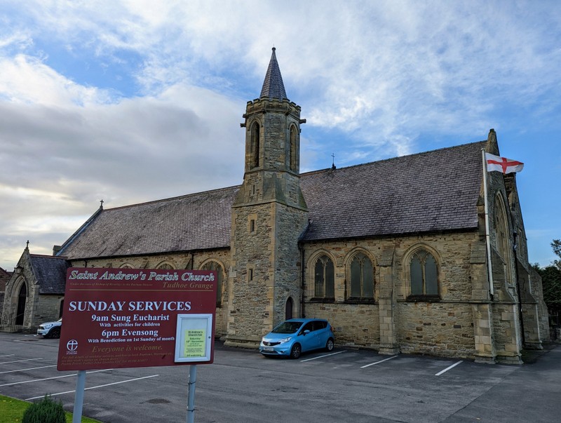 In this fairly unique arrangement, the vicar is in charge of 2 churches, as is common, but the other church is quite some way over in Bowburn, just outside Durham – and in a different deanery. Very noticeably, in between the two stands a brand new and very large Amazon Distribution Centre, complete with new roundabouts and roads. A sign of the times indeed. St. Andrew’s itself is built in an area of Spennymoor that originally housed workers of the old iron works. The air is much cleaner these days, and has become quite a desirable area to retire to, cheaper than Durham but easily accessible to the city.