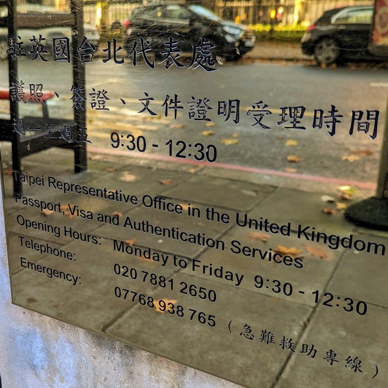 This is the Taipei Representative Office in the UK 駐英國台北代表處 at 50 Grosvenor Gardens, London SW1, the highest-level representation of the Taiwan government in the UK.