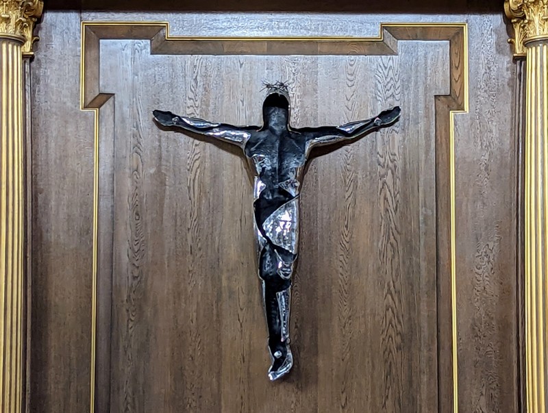 Crucifix by Simon Robinson 1994, behind the altar at St. Mary le Bow Church, Cheapside, London EC2
