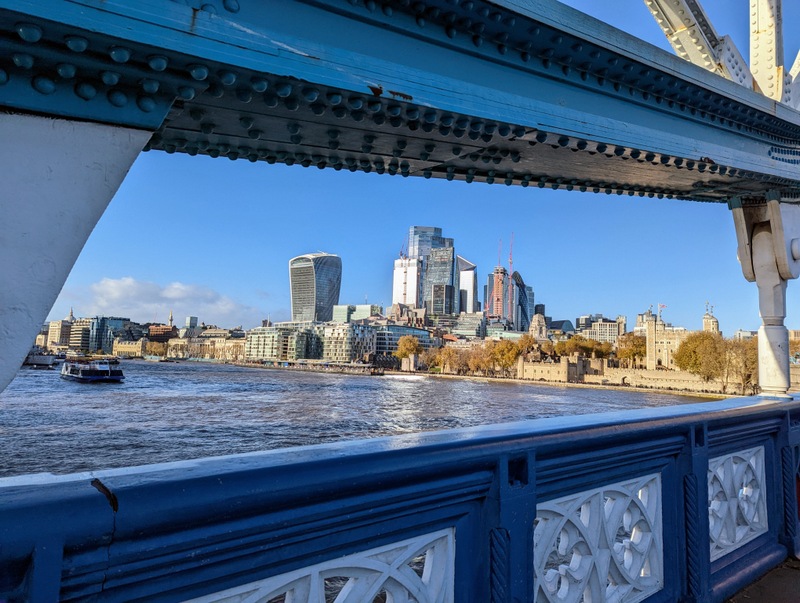 View through Tower Bridge towards The City and Tower of London