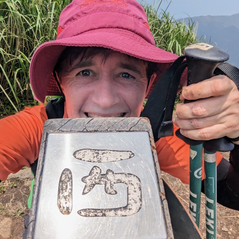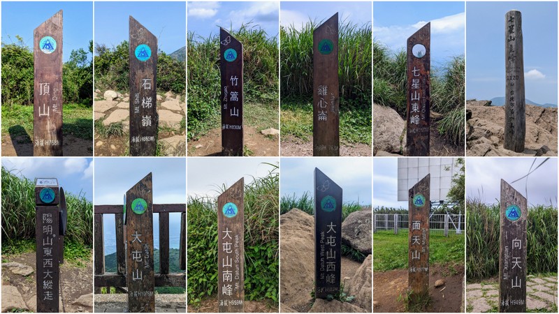 Just north of Taipei City are the Yang-Ming Shan 陽明山 mountains, and the ones that are open to the public are a long ridge of 10 summits, volcanic in origin, mostly very steep and some oozing sulfur from the fumaroles (that’s what you can see in the above photo ~ the sulfur smell is very strong)! All 10 are within the Yang-Ming Shan National Park 陽明山國家公園, with well-maintained paths and the summits all marked with posts. On the top of each post is a Chinese character in metal which can be rubbed with a pencil (like a brass rubbing) or photographed, and together the 10 characters form the phrase: ‘陽明山東西大縱走活動’ translated as ‘Yang-Ming Shan East-West Vertical Traverse Activity’. This is the official name of the hike, and Saturday was the day! The photo below shows the 10 posts, in order from east to west, left to right, with 2 extra posts, one of which is the post on top of the highest mountain on the traverse, Mt. Qixing, 1120 m.