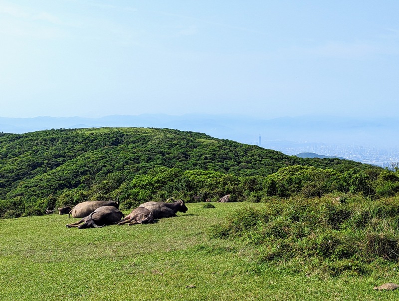 The hike continues to Jixinlun 雞心崙 (763 m), the highest point on the Lengqing Path that leads from Qingtiangang to the Lengshuikeng Visitor’s Center 冷水坑遊客服務站. There were several cattle alongside the path…