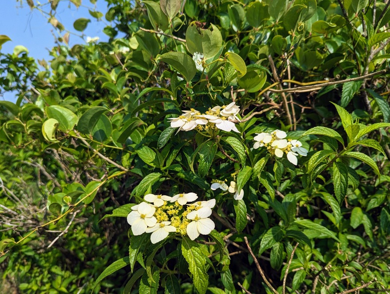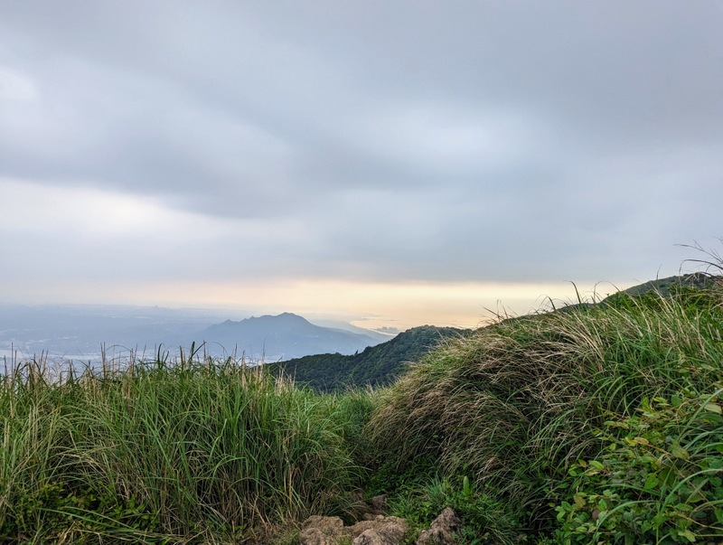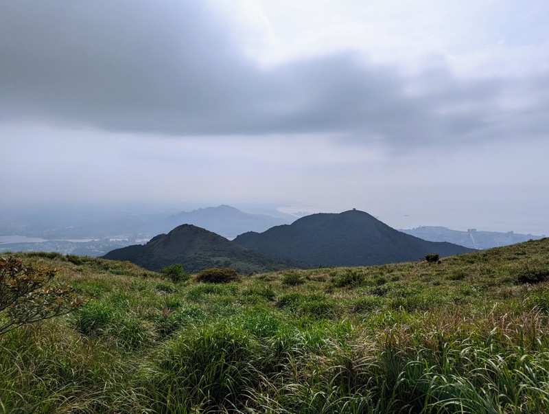 Xiaoyoukeng is about the halfway point of the traverse, and the path to the start of the second half, the Datun section, goes along below the Balaka Highway – it’s a lovely path, and often the place where I see snakes. There were no snakes on Saturday, but the weather was beginning to change a little, and the heat was lessening. From Anbu, the trail turns left and starts the ascent of the Datun range of mountains. The first (and highest) summit is Mt. Datun Main Peak 大屯主峰 (1076 m), actually the second-highest summit of the whole day. It’s summit No. 6 of the whole traverse, and really from here, you have the feeling that the end is in sight. It was 3:00 pm by now, the sun was gone, it was overcast and the views were hazy. But it didn’t rain!