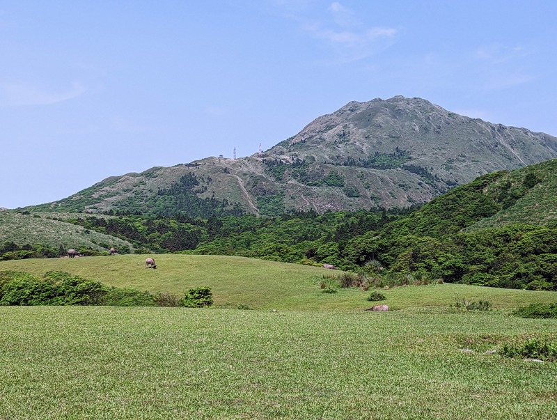 Another hour later, at about 10:00 am, and I arrived at summit No. 3, Mt. Zhugao 竹篙山 (830 m) which is now fully open to the public, but the summit marker has no Chinese character on the top! The big round thing in the photo is one of many in that area, originally built for military defence, like a pillbox. The views are amazing, all over Qingtiangang 擎天崗. This is the first section of the hike completed, yes!