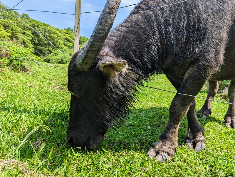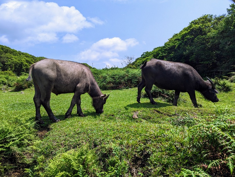 This is the area where the famous Yang-Ming Shan cattle live, and we saw quite a few. There are 2 kinds, water buffalo and Tajima cattle (distinguishable by their horns, buffalo have large curved horns in a crescent shape, Tajima have smaller, straighter horns) and they’ve been living up there since the days of the Qing Dynasty. They are now semi-wild, managed by the National Park authorities. The sorry saga in 2020 of how the cattle had become such a tourist attraction over the years that trouble was inevitable – and when someone was attacked and killed by one of the cattle, so the authorities decided to enclose them behind fences. But the space they were given was clearly not large enough and the grass provided insufficient nourishment that an unusually high number of them died that year. So now, there’s a different management policy that has reopened areas to the public, but with large safety notices, bollards to help you escape from any charging cattle, and a big education program to make people aware of the dangers of approaching too close.
