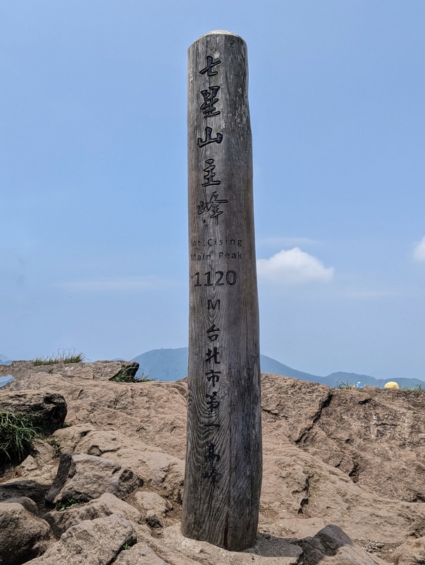 At 12:00 noon I got to the main peak of Mt. Qixing 七星主峰 (1120 m), with its 2 marker posts….