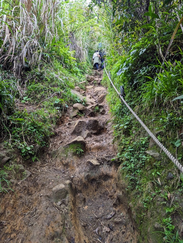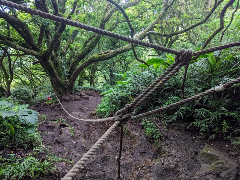 This section of the walk, Mt. Datun South and West peaks is the most thrilling of the whole traverse, with ropes to help you pull yourself up and down the very steep slopes. The main thing on Saturday was mud, it was oh so muddy – just don’t do this hike in white shoes! Lots of people emerged from the hike covered in mud and very dirty. First though, the hike down from Mt. Datun Main Peak is steep stone steps, and then a nice walk up to the summit of Mt. Datun South Peak 大屯南峰 (959 m).