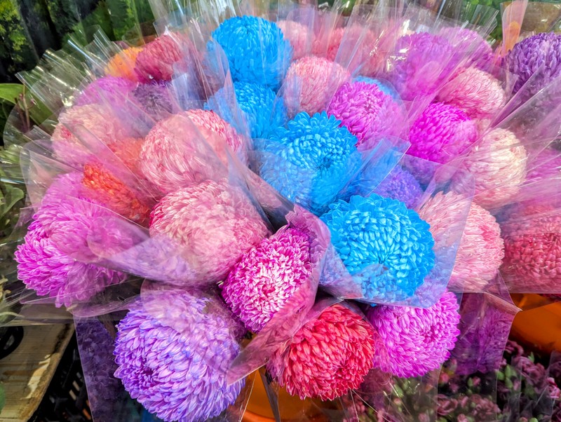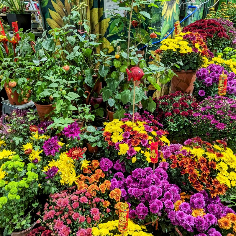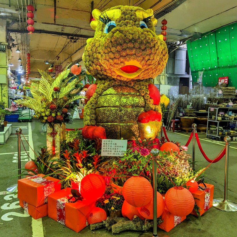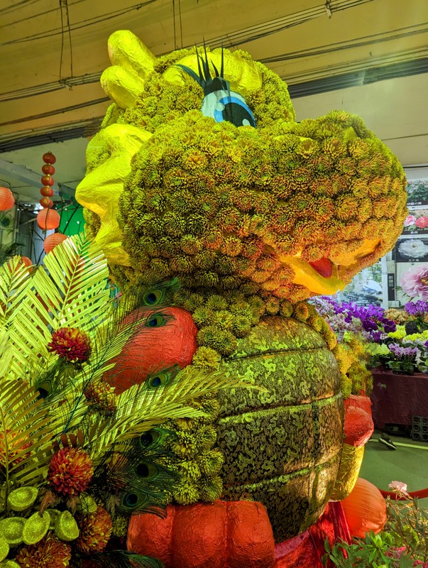 Not far away is the Jian-Guo Flower Market, normally open at weekends in a car parking area under one of the expressway overpasses, but open all this week too. Check out the dragon at the central flower display…