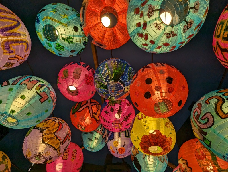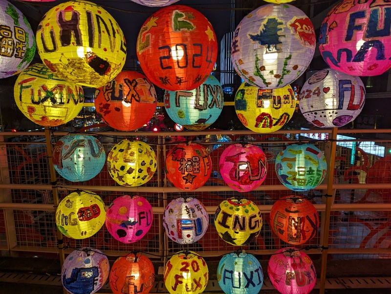 Continuing on with the street celebrations ~ this was Taipei’s bustling area of Ximending tonight, in between heavy rain showers! This is a major shopping area for young people – and tourists, and there were plenty of both. The lanterns on the footbridge, especially those handmade by local schools were especially beautiful!