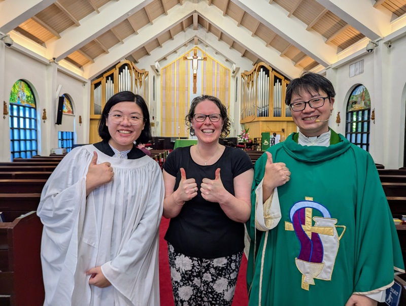Katherine arrived in Taiwan on Saturday July 6, the same weekend that we at St. John’s Cathedral, Taipei started saying goodbye to my neighbours, Rev. Joseph Ho and family as they moved on to St. Stephen’s Church, Keelung, starting August 1. In fact, we spent most of July having farewell meals and parties for them ~ they are much loved and already much missed! Joseph has been replaced by Rev. Claire Wang, who just graduated from Virginia Theological Seminary, USA, and was ordained deacon on July 22. She came to preach at the St. John’s Cathedral English Service on Sunday July 7, and Claire then spent most of the next 2 weeks accompanying Katherine on her placement at Hsinchu. My friend, Ah-Guan was also staying the weekend with us, and on Monday morning, we got Katherine out at 5:00am for early morning exercise – including praise dance in the park! Later that day, we met Bishop Chang at the diocesan office for lunch, before Claire took Katherine off to Hsinchu. I asked Claire yesterday about her experiences working with Katherine. Her eyes lit up and she said that Katherine is so creative, positive, and energetic, and she quickly immersed herself into the culture. She said they worked so well together, and she learned so much from Katherine about children’s outreach and church planting.
