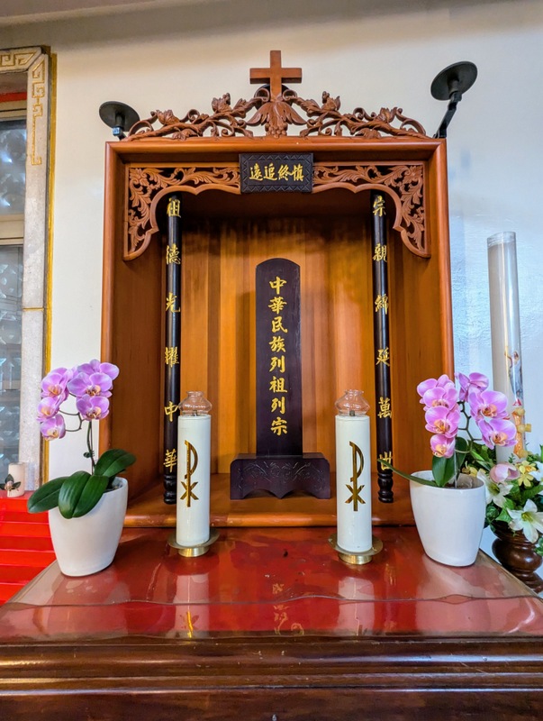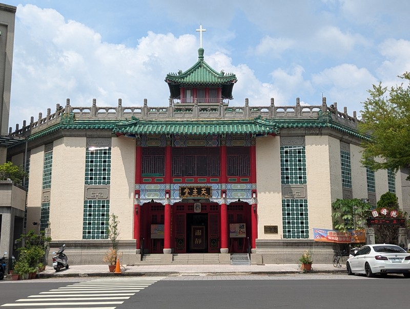 Summer in Taiwan is extremely hot and humid, and for most of July it was 30-35°C each day, often with major afternoon thunderstorms, so we planned our sightseeing to avoid the worst of the heat. After a nice Japanese lunch with Rev. Cheng and his wife, we visited the Tainan Roman Catholic Cathedral, my first visit. It is built in an extremely distinctive Chinese architectural style, and is known as the Cathedral of Our Lady of China (中華聖母主教座堂). We even met the RC assistant bishop, who had been Rev. Cheng’s former tutor and chaplain at Fu-Jen RC University, Taipei. His surname is also Lai, so we met 2 Bishop Lai’s on the same day in the same city! Having asked several Taiwanese Christian friends their opinion of the cathedral, they find it interesting, but the large incense burner in front of the altar and the overall design reminds them too much of a Taoist Temple, and the statue of Mary outside looks like the goddess Guanyin. It is certainly all very thought-provoking!