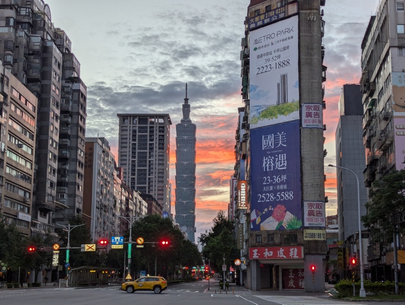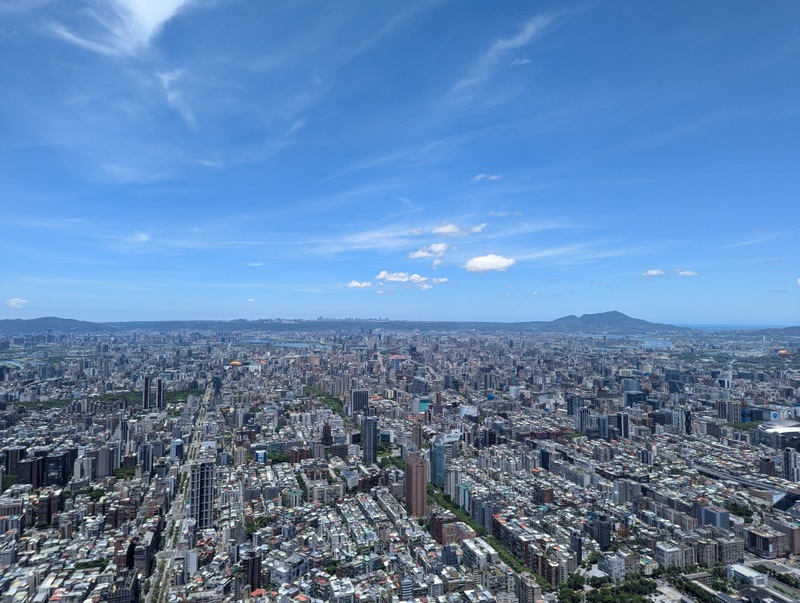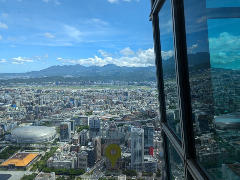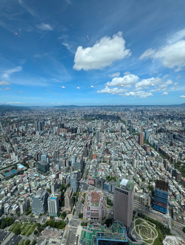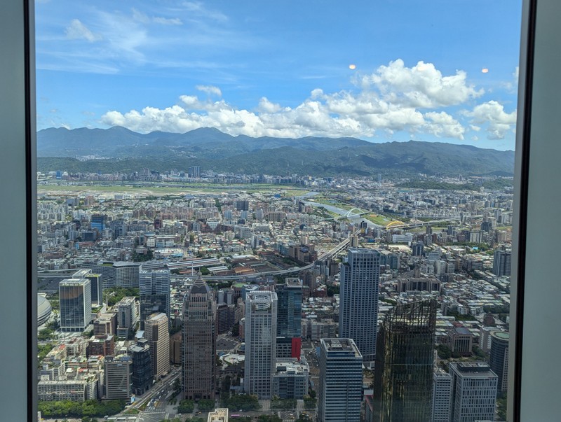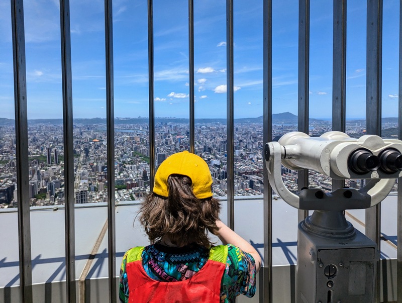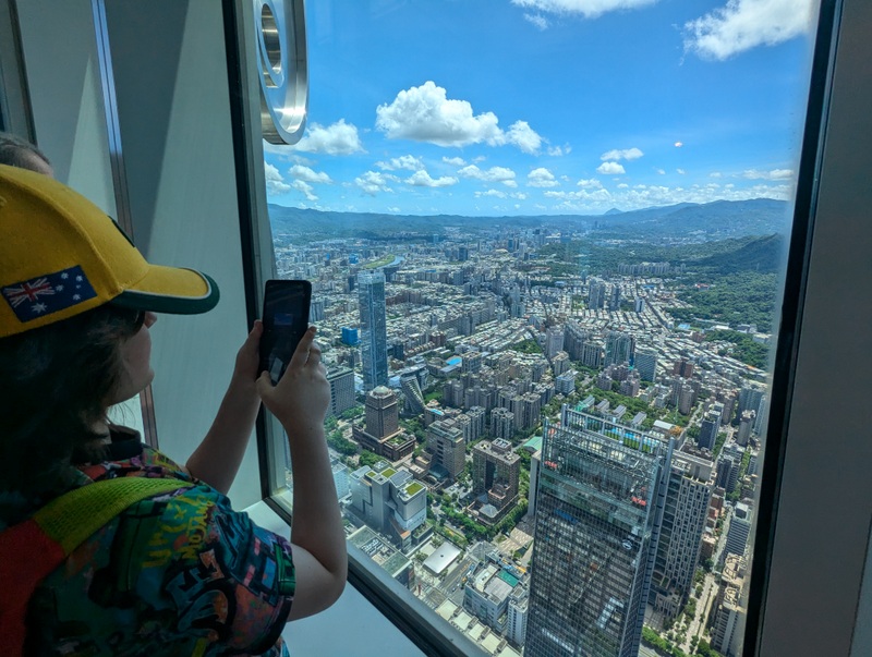 And off we went into Taipei to meet Katherine who had finished her placement that afternoon, and so was free to spend the next 9 days with her family. By then, reports were coming in of a typhoon forming near The Philippines, where there was already severe flooding, and several ships were reported stranded or missing. The typhoon was traveling towards Taiwan, and expected to arrive on Wednesday or Thursday. As often happens the day or two immediately before a typhoon, the weather promised to be excellent, so for their first morning in Taiwan, Monday July 22, we went up Taipei 101, Taiwan’s tallest building. There are spectacular views from the 89th and 91st floors, and the world’s fastest elevators to get you there, it takes only about 40 seconds from the 5th floor to the 89th! The weather was indeed fantastic and the views amazing…