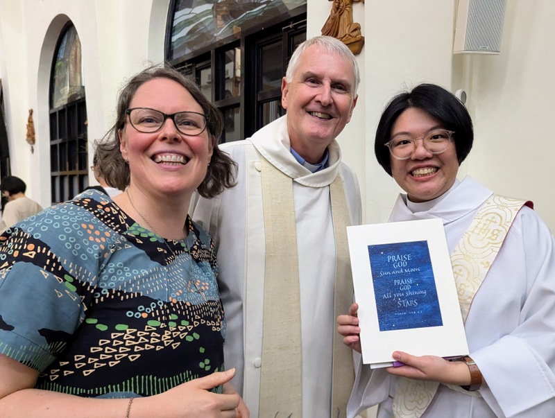 That evening, Monday July 22, there was an ordination service in St. John’s Cathedral for 3 new deacons, Rev. Christina Hai, Rev. Alex Tso and Rev. Claire Wang. Claire had invited Katherine’s father, Robert to bring his robes and join the procession. Undaunted by any jetlag, and fresh off a long journey from the UK, so Robert joined the ordination service as a visiting clergy, and reported how wonderful it was! It was good that Katherine could also introduce her family to everyone, including the Rev. Charles C. T. Chen, from St James’ Church, Taichung (left photo below). The Coopers come from Durham, and Bishop David Lai and Rev. Charles Chen both have very clear memories of their visit to a pre-Lambeth Conference event at Durham Cathedral in 2008. At the cathedral entrance, they discovered that only bishops and their spouses were allowed to enter, so on the spur of the moment, Bishop Lai introduced Charles as his Canon, which gained him immediate access. The Diocese of Taiwan is so small that we don’t have any canons, so we delight in telling people that Charles was ‘The Rev. Canon Charles C. T. Chen’ for that day at Durham Cathedral! In the right photo below are Robert and Katherine with Claire holding her gift from Robert. For all the ordination service photos, see my previous blog post here.