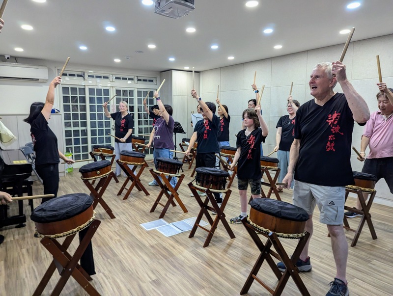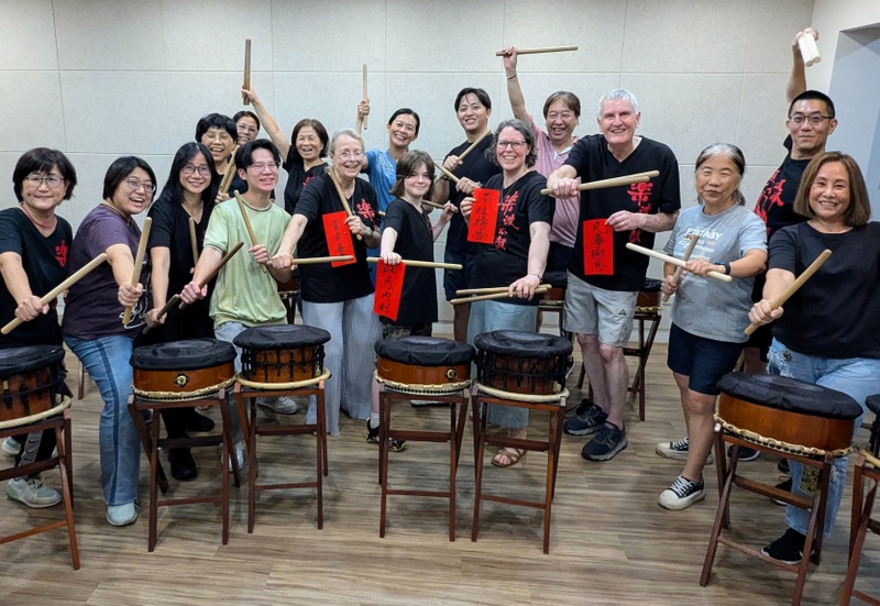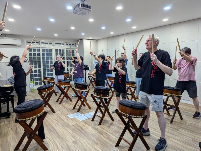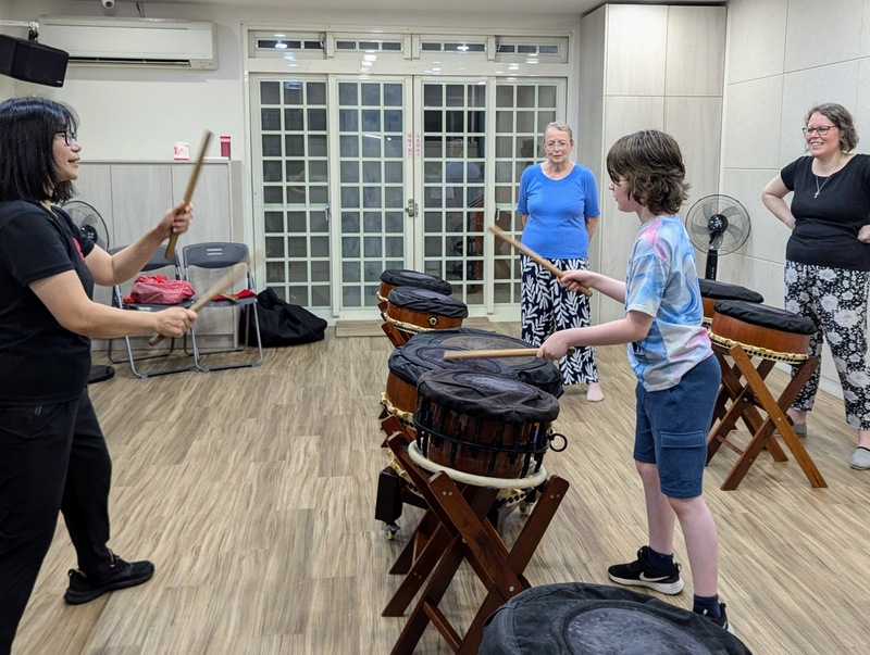 On Monday evening, all dressed in their black Taiko drumming T-shirts, we went to watch the Taiko Drummming Class at the cathedral, at Linda’s kind invitation. Actually, we were invited to join the class and play for an hour ~ it was very special! I didn’t stand a chance of keeping up with the rhythm, and Robert gave up soon after, but it was great to watch the others; they kept up and did really well! Everyone was so happy ~ and Linda’s son, Daniel had written some phrases in calligraphy for the Cooper family, what a special gift!