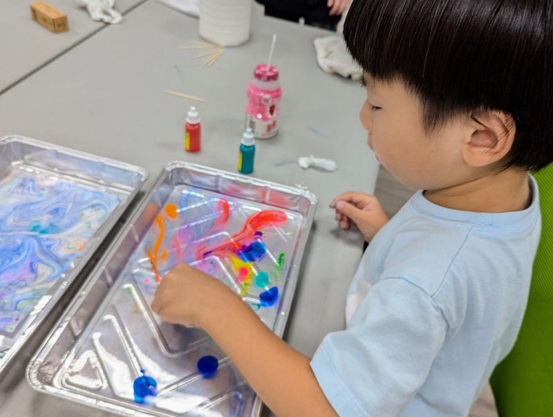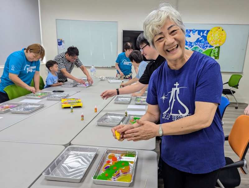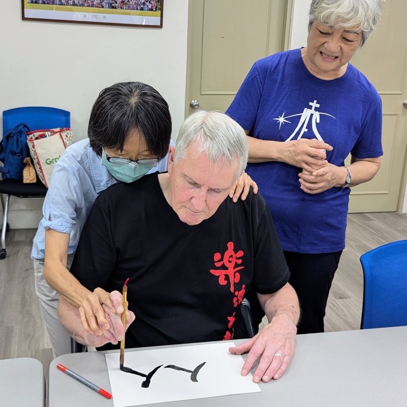 After lunch, we arranged that Katherine and family would hold a mini-version of their Creativity Workshop at the diocesan office. We invited friends and church members, including my good friend, A-Tu from Trinity Church, Keelung who also brought her own calligraphy brushes and ink to teach Robert some Chinese calligraphy. He was so happy! The rest of us made leaves with the words, ‘One in Jesus’, to go on the Tree of Life banner that Katherine had made. We had black and white photos printed out, and we stuck them on, along with stickers. It was a beautiful result. We also used marbling to produce prayer journals. Yes, it was a wonderful afternoon!