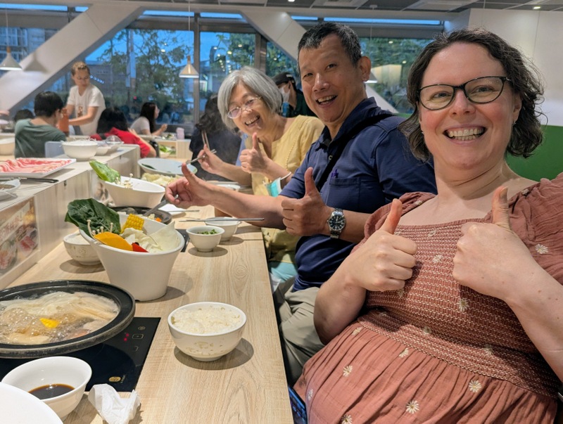 By then, threatening storm clouds were gathering, and we just got back to the car as the heavens opened. Massive rains fell and motorbikes were swishing their way along the flooded roads! After a short visit to Grace Church, Rev. Cheng and his wife took us for a yummy hotpot dinner, and then we left to return north, Katherine to Hsinchu to start Week 2 of her placement, and me to return to Taipei…