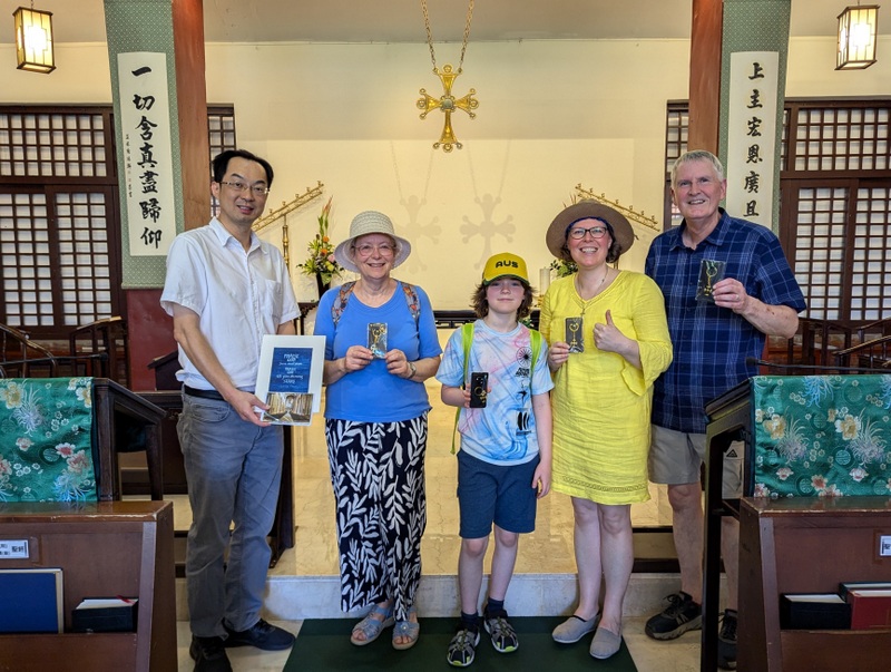 In all my years working with the Church Mission Society (CMS) and being supported by so many wonderful link churches in the UK, it is rare indeed that any of the link church vicars have the chance to actually come and see for themselves what’s going on in Taiwan ~ but it’s just happened, whoopee! The Rev. Robert Cooper and his family were just here, and we had such a great time together! I’ve known Robert since the mid-1980’s, before I joined CMS, when he was Arts Chaplain for the Diocese of Durham, and I was part of St. Michael’s Church, Heighington; I remember he took our church group for a weekend in the North York Moors and we designed and made a huge Celtic Cross together. He was also vicar of St. Andrew’s Church, Sadberge, Darlington, and later, they became one of my link churches, supporting me and CMS in prayer and with financial gifts, and I would visit them every time I was in the UK. Robert is now retired and busy doing photography and calligraphy, though still serving part-time as a hospital chaplain, and Sadberge is now joined with St. Andrew’s Church, Haughton-le-Skerne, which is also one of my very supportive link churches, led by Rev. Mark East and Rev. Sue Chew. They promised to pray for Robert and his family on their visit to Taiwan – thank you to everyone in Haughton and Sadberge!