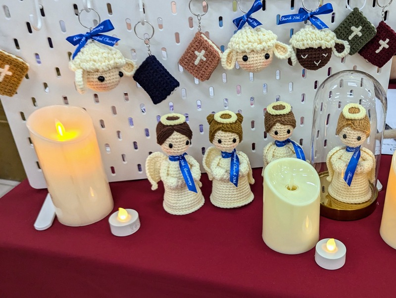 During the lunch break, we all had boxes of yummy finger food, bread, cakes and drinks, the idea being that we could walk around and visit all the lunchtime attractions, the diocesan exhibition of photos from all our churches, watch the new video made specially for the 70th anniversary introducing each church, and most exciting, visit all the stalls set up by different church members to sell their homemade crafts, dried flowers, keychains, cactus plants or second-hand goods. Of course there was not enough time to reconnect with everyone, but it was such fun to meet up with lots of old friends.