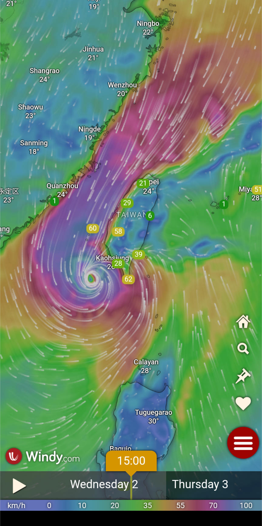 Updated October 7, 2024: Typhoon Krathon proved to be extremely unusual in that it slowly circulated round and round in the seas south of Taiwan, hardly moving for days, which delayed its arrival – leading to much uncertainty about what to expect. Weather forecasts predicted it would make landfall in the far south near Kaohsiung, move northwards along Taiwan’s N-S axis and exit into the ocean in northern Taiwan over the weekend, so schools and work were cancelled across Taiwan for 2 days, Wednesday and Thursday last week, in preparation. However, contrary to all expectations, once the typhoon finally did make landfall on Thursday October 3 in Kaohsiung, it dissipated within 24 hours, and by Saturday it was gone.