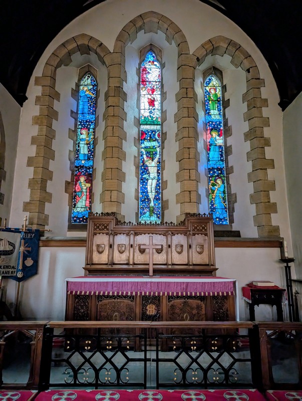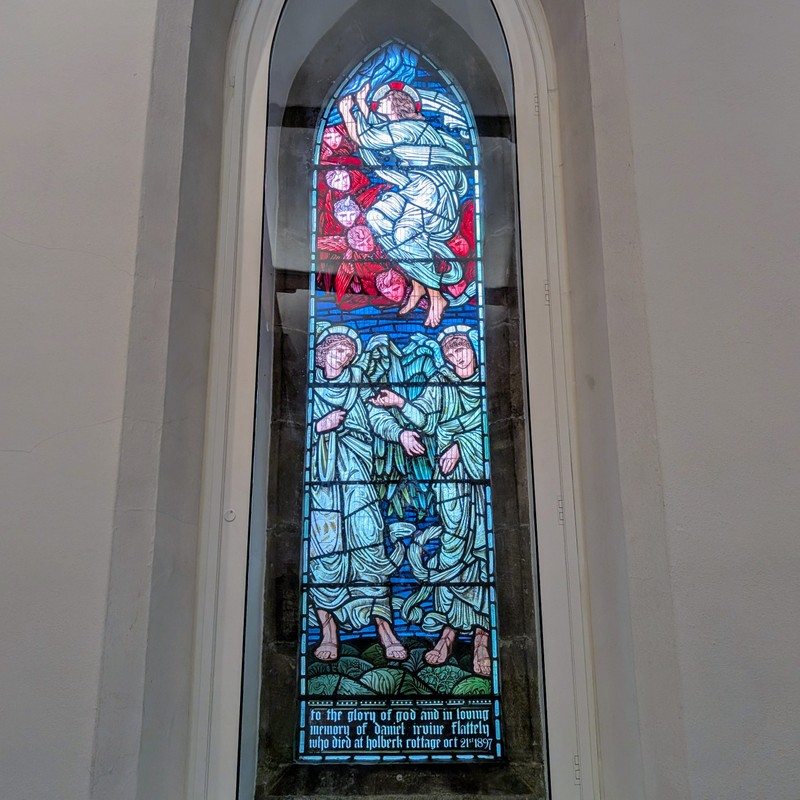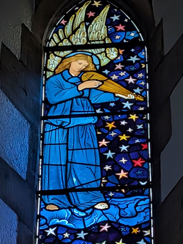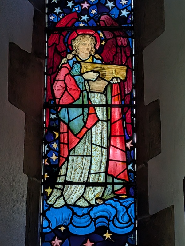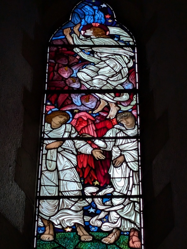 During my visit to the UK, I mostly stayed in Staveley, near Kendal. St. James’ Church, Staveley has some stunning pre-Raphaelite stained glass (some of it identical to the stained glass at Jesus Church, Troutbeck) – mostly designed and made by Edward Burne-Jones, William Morris and friends, who used to go fishing in the area. One of the blue angels at Staveley was even used for the Christmas postage stamps in 2009….