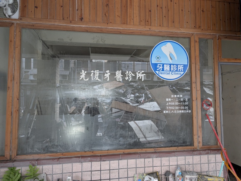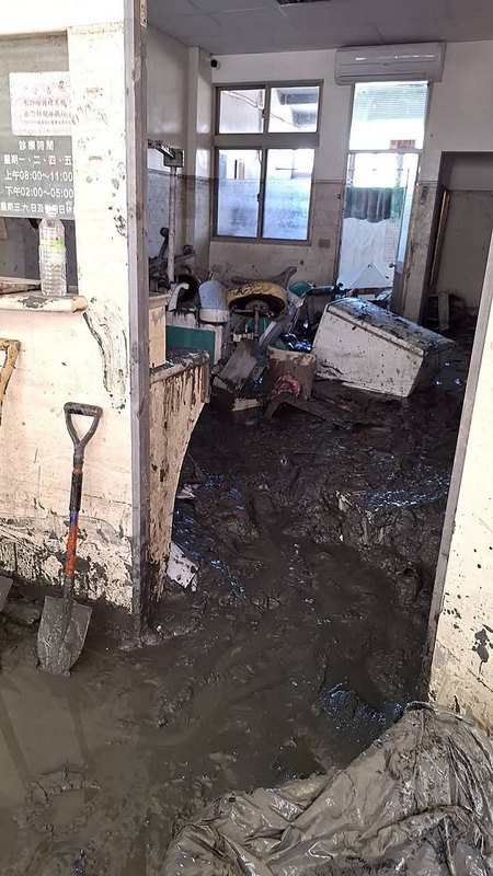 Dr. Kuo is originally from Hong Kong, and many years ago, he came to Taiwan to study dentistry at what is now known as Kaohsiung Medical University. After graduation, he got a job in the Mennonite Hospital in Hualien, which is where he met his wife, who is from Hualien. Dr. Kuo had grown up in St. Stephen’s Anglican Church, Hong Kong, and so when he moved to Hualien, he joined St. Luke’s Episcopal Church. He and his wife were married there on December 3, 1982 and one month later, on January 2, 1983, they opened their dental clinic in Guangfu, the first – and for many years the only – dental clinic in the town. They’ve served there faithfully ever since, and have brought up their son in Guangfu; he now lives overseas. Even though Dr. Kuo and his wife are now in their seventies, they hadn’t retired, and the clinic was still going strong right up until the day the floods came, which was Tuesday, September 23. These are some of the first photos taken immediately after the floods.