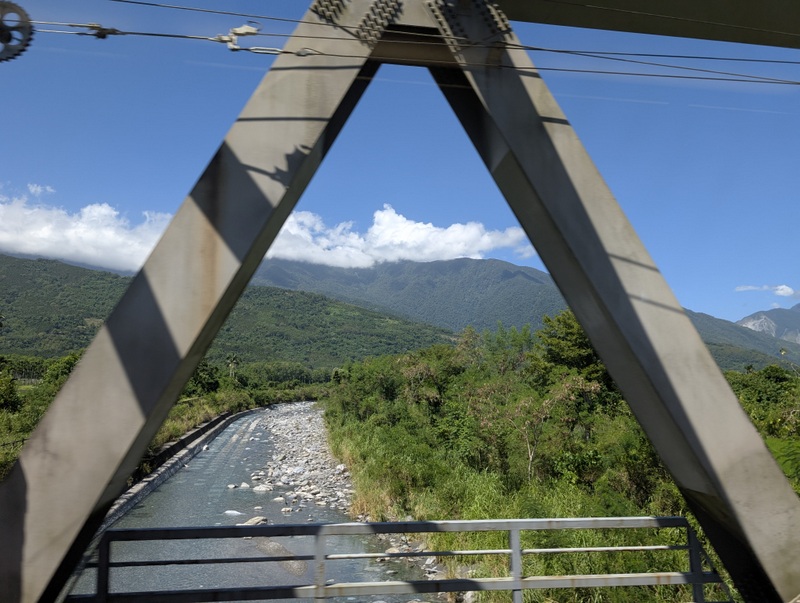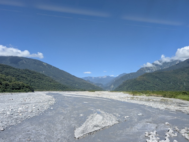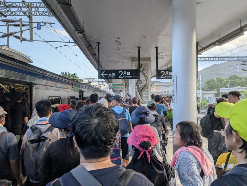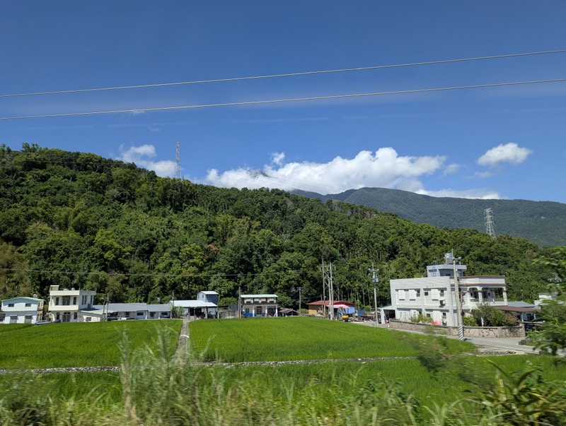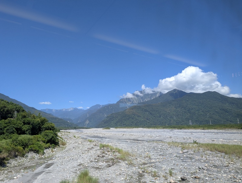Estimates put the number of volunteers who turned up at Guangfu last weekend at 30,000-40,000 each day, most of them traveling there by train. Though the main road bridge over the Matai’an river was washed away in the flood, fortunately, the railway goes through a tunnel under that same river, and so has not been affected. People were encouraged to stay in Hualien and go by train each day, with many extra trains put on to accommodate everyone. The journey is about 30-40 minutes. That’s what we did. And the train journey from Hualien to Guangfu is beautiful, you’d never know that you were approaching a scene of a major disaster.
