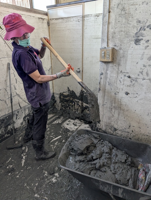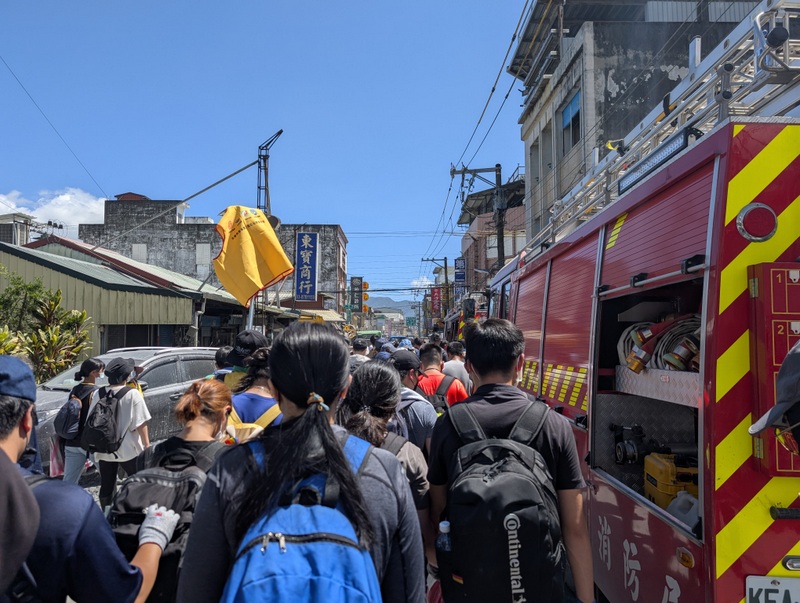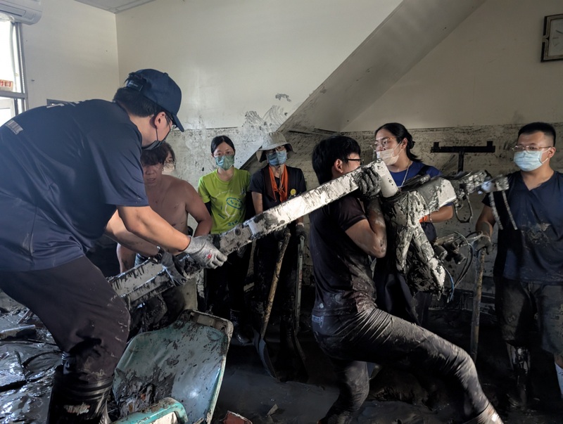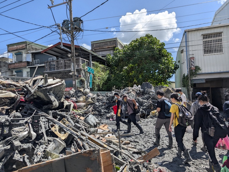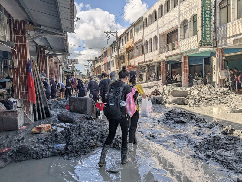 The train from Hualien, packed to the limits, pulls into Guangfu Station. It’s Sunday, September 28, and Taiwan has a 3-day holiday weekend for Teacher’s Day, Confucius’ Birthday. It’s the smell that gets us first. Then the dust. It’s everywhere, in our eyes, nose, and mouth, covering our phone screens. Facemasks are essential. But the heat, oh the heat, and facemasks just make it hotter and even more unbearable. Then there’s the mud, sludge, and water covering everything. Trudging and squelching our way down through the town in the mud, we join thousands from all over Taiwan who have descended on the small town of Guangfu to volunteer. Men and women, old and young, skilled and unskilled, friends and total strangers, we have all answered the call to come and help. We weave among bulldozers and lorries that are hard at work trying their best to clear all the mud and piled-up debris outside people’s homes. It’s all surprisingly well-organized; the army, police, and traffic wardens all on duty, directing us around and along back roads to our destinations.