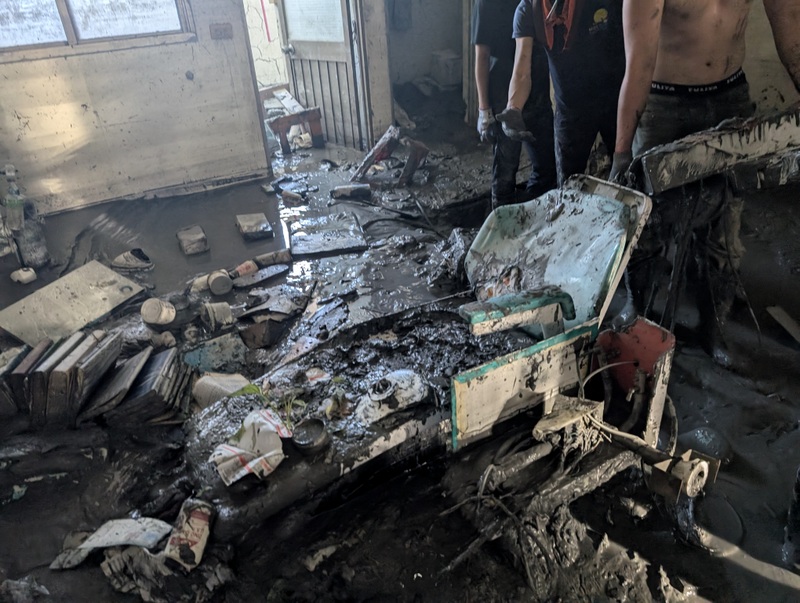 Their neighbours too have had a similar experience. We got to meet some of them, there’s a pharmacy and a hair salon on one side, a cram school on the other, and across the road, a doctor’s surgery. All of them have been there for years, and all were using their ground floor as a business, a classroom or a home. Everything has now gone. It is really a tragic situation for all of them, and for the whole town. But all of them were so grateful, firstly, that they are alive, because many people who live in one-storey homes further down the road towards the river couldn’t get out in time – and the further down towards the river you go, the deeper the flooding. We did go down there, it’s really on the edge of town, and the area is mostly rice fields, now covered in thick sludge. People needing volunteers to come in and help have posted notices – including on the teddy bear.