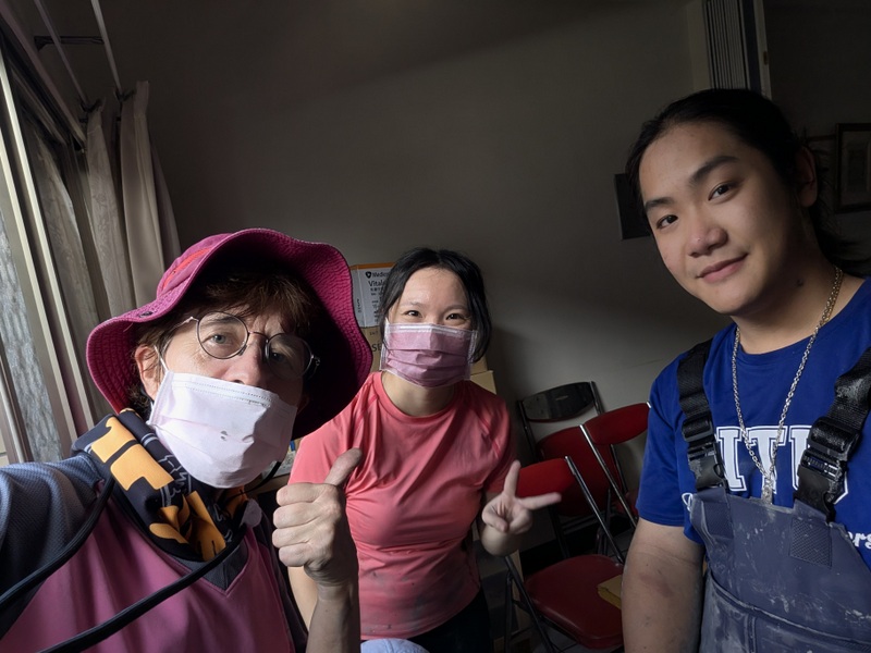Everyone in Guangfu was full of praise and gratitude for all the volunteers who came to help. We went as part of a group from the Taiwan Episcopal Church, led by Rev. Joseph Wu, vicar of St. Luke’s Church. He and his wife and a team of church members went every day for almost a week to offer help and support to Dr. Kuo and his wife. Other helpers came from other churches and Christian relief organizations; some just appeared off the street. The camaraderie and sense of community among everyone was amazing, everyone working together, using their gifts, skills, strength and energy to help. And it was hard work, digging and more digging in the heat, though we were fortunate to have a large team, so we could take it in turns to rest. As there was no power on the ground floor, so the clinic was quite dark throughout the day, and once the sun went down mid-afternoon, and to get a ticket on the train, so volunteers started to depart. Others had tickets for the evening train back to Taipei, so they would arrive just as others were leaving. It all worked out great! We had all taken our own food and a lot of water to drink, but there were volunteer cooks in town and lunch boxes were provided if we wanted them. And everywhere we went, people were shouting out ‘Thank you’ and ‘jia-you’ (Keep going!) It was all very moving.