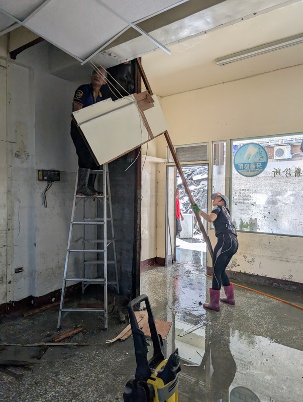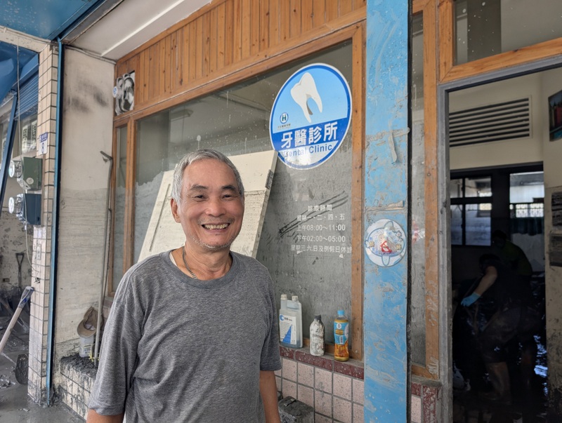 Dr. Kuo’s dental clinic is on the ground floor, and the couple live on the 2 floors above. Fortunately, when the floods came, they managed to take refuge on the upper floors of their home. That’s also where we found ourselves soon after arrival last Sunday, when the warning went off that more water was coming. There is still a danger of more mudslides, although on that occasion, nothing happened and we were fine. As we looked out across the street, we could see everyone gathered on the top floors of the homes opposite. About 30 minutes later, the all-clear was given and we could resume work.