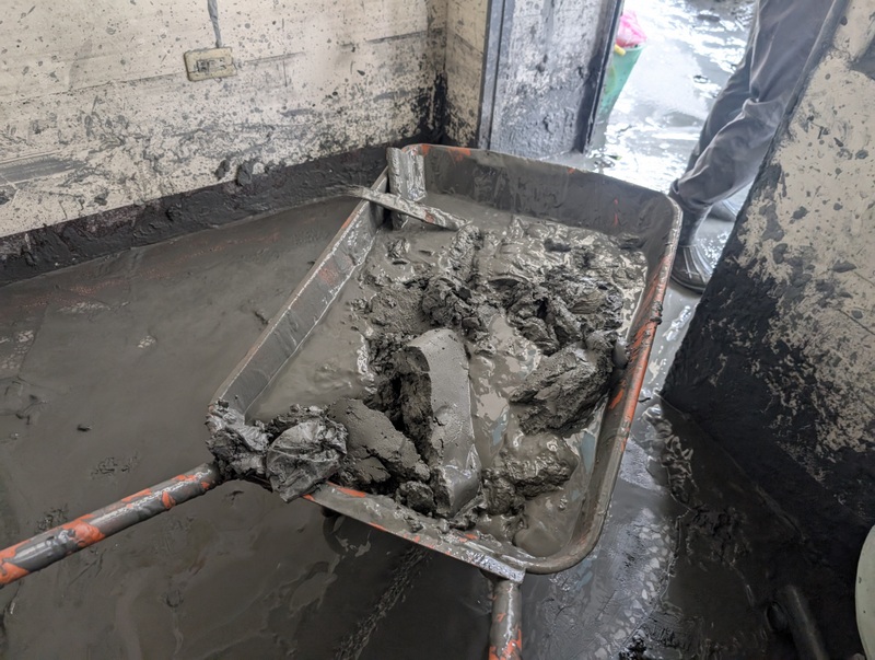 On the Tuesday, the third day of our visit, Mr. Hsu brought along a high-pressure hose to clean down the walls. Even getting that equipment into Guangfu was quite an adventure because the main road bridge has been washed away, and traffic on the other smaller roads is strictly controlled to only allow essential vehicles in and out, so Mr. Hsu had to push his equipment a long way through town in a wheelbarrow. We also cleaned up the floor above, where Dr. Kuo and his wife have their living room. Though not deluged in mud, like the floors below, the white floor had become completely dirty due to us all traipsing up and down the stairs in our muddy boots. Everywhere was also full of dust. When we left Guangfu on Tuesday evening, after 3 days of hard, strenuous, back-breaking work, the ground-floor clinic was completely empty, apart from the remains of the dental chair, which was bolted to the floor.
