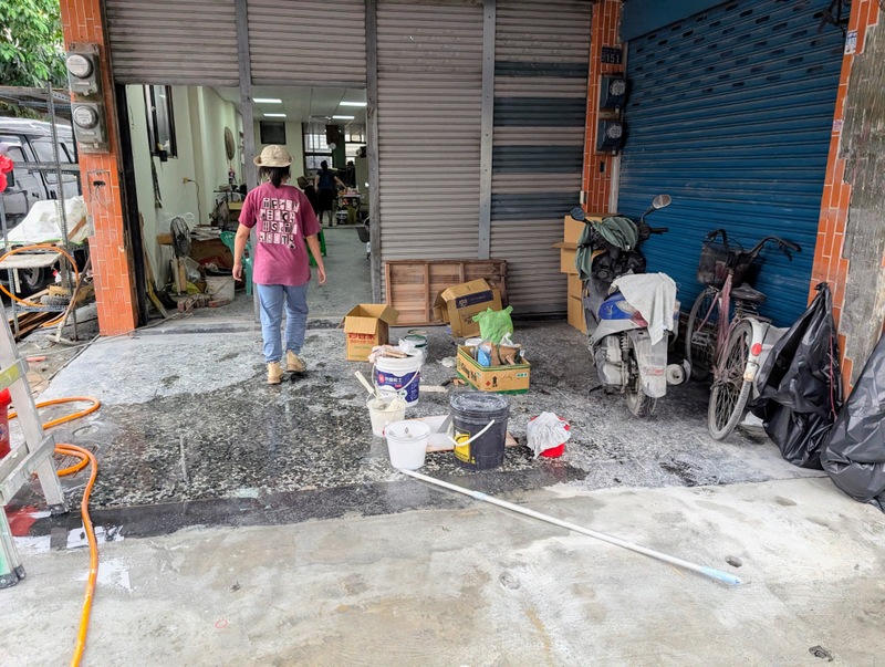 The days and weeks that followed the disaster saw the people of Taiwan respond by donning their Wellington boots, picking up their shovels, and making their way by train to Guangfu to help. Tens of thousands responded; everyone was welcome, and it was all fairly amazing. Dr. Kuo and his wife are devoted members of St. Luke’s Church, Hualien, located 50 km north of Guangfu. The Rev. Joseph Wu, vicar of St. Luke’s, was one of the first people to arrive at Guangfu the day following the tragedy, checking to see if Dr. Kuo and his wife were OK. Along with a team from St. Luke’s, they went every day for about a week to help clear out the mud. A group of about 6 of us from the Taiwan Episcopal Church joined them for the 3-day Teacher’s Day weekend at the end of September, followed later by Rev. Joseph Ho and his wife, Angel and family, plus church members from Keelung, and others too. All of us remember the hard work, the mud, the dirt, the dust, and the smell. It was awful, but it was also wonderful to join in the relief effort; the sense of camaraderie among us, men and women, old and young, local and international, individuals and groups, of different faith groups, backgrounds, and jobs, all brought together to clear the mud from the dental clinic. By the time we left, the clinic was being washed with high-pressure hoses, and after a few days of drying out, the clinic was then plastered and painted. The Ho family took their children along to help with the painting; they are all good friends with Dr. Kuo and his wife since their time serving at St. Luke’s Church, and the kids could get into small spaces to paint, like under the stairs. Age was no barrier to helping! This is a small selection of photos showing the progress of our work over that September weekend…