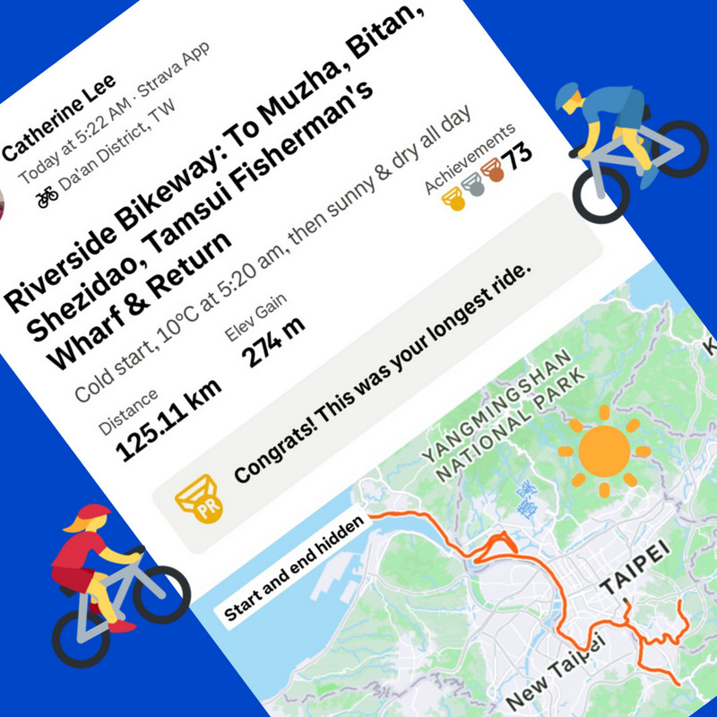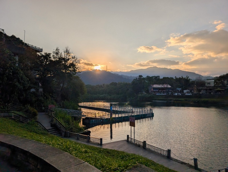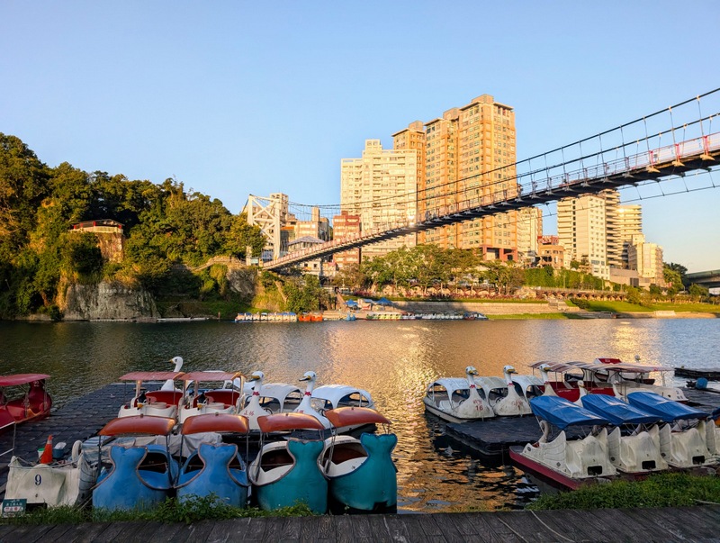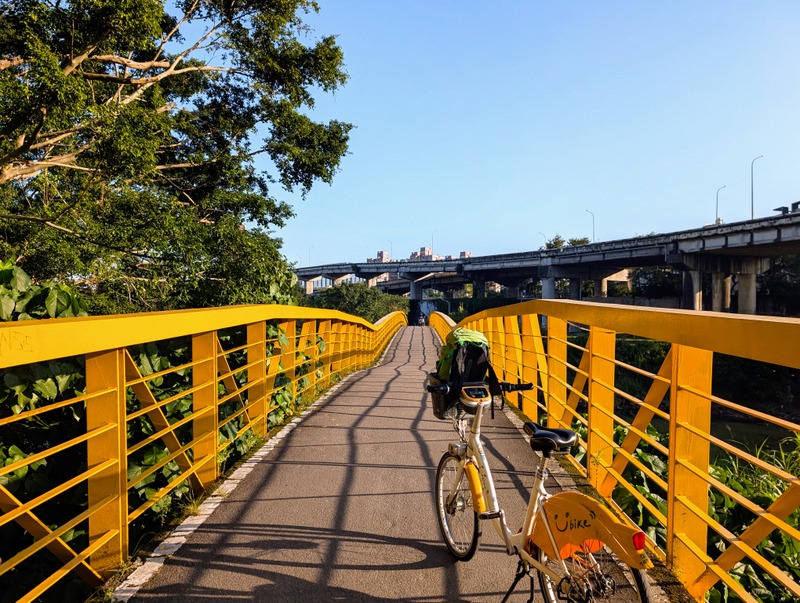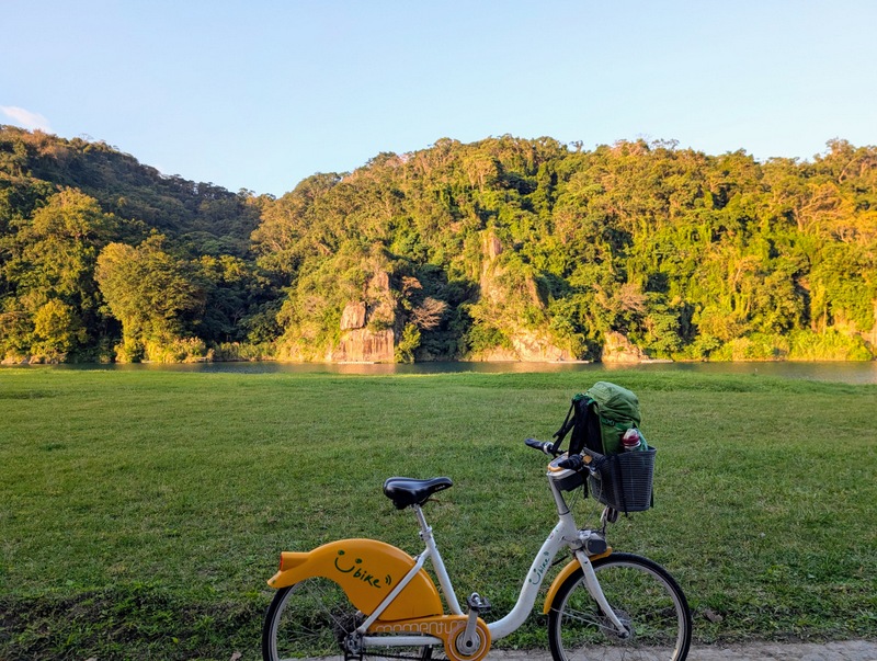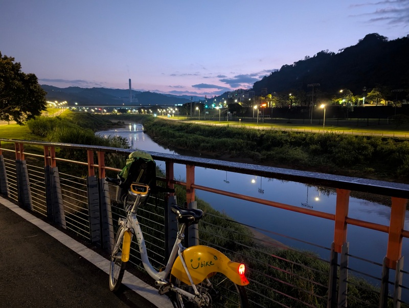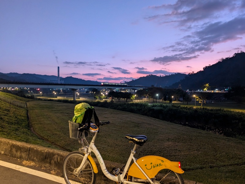 This was not just any old cycle ride. π΄ It’s not every day, after all, that I meet a dinosaur riding around Taipei City on a yellow U-Bike. This was Saturday, January 10, with a cold 10Β°C to start the day, and dark until about 6:20 am. At 5:20 am, off I set, to try and get all the way from the start to the end of the great river (Tamsui River and its upper branches, Jingmei and Xindian Rivers) that runs all the way through Taipei – and back. This means riding from Gongguan 50 minutes upriver to Muzha, at the end of the MRT Brown Line, also the location of Taipei Zoo and the big giraffe-painted incinerator chimney. By then, dawn was breaking, with lots of people out and about, exercising, running, cycling, roller-skating, dancing and walking. After dawn at Muzha, back along the bike path and to Bitan for sunrise, famous for its scenery, paddle boats and weir. From there, off northwards to Shezidao by mid-morning, then to Guandu and so to Tamsui Fisherman’s Wharf at the rivermouth by noon – and back home by 4:00 pm, in time for ice-cream. Family Mart has a new flavour each month, and this month it’s strawberry, so yummy.